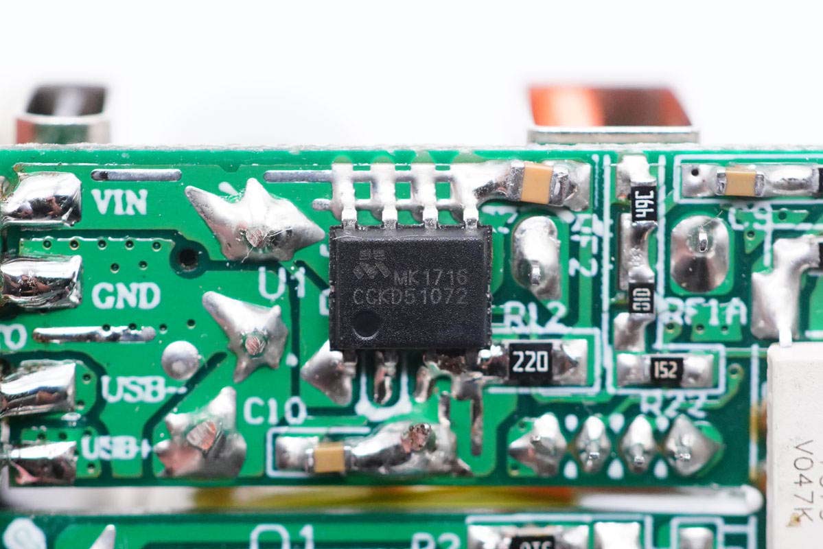 輸出濾波固態電容來自福建云星電子有限公司,規格為25V?680μF?!癥X”牌固態電容專門針對USB PD快充設計,在105℃的工作環境下仍能保證2000小時的壽命,同時兼具耐高溫、耐大紋波、低ESR等特性。
