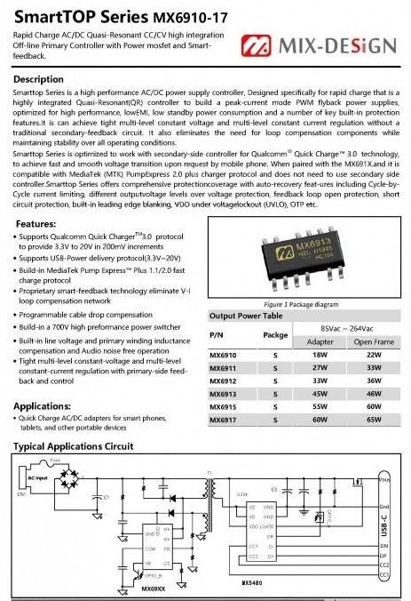 主控芯片采用美思半導體SmartTOP系列,型號MX6911,這是一款高性能開關電源控制器,專為高度集成的快充適配器設計,為高效率,低待機功耗而優化。