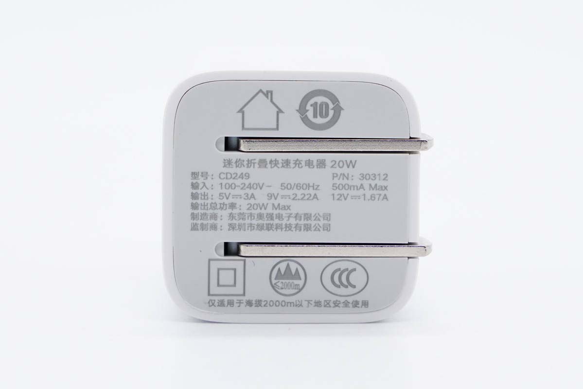 綠聯小金剛20W PD快充充電器機身亮面設計,整體小巧而光滑,上手體驗該好。輸入端切面設計,可以更好的貼合插座或墻壁,使用更穩定,配備可折疊插腳外出攜帶更方便。充電器支持QC、PE2.0、PD、PPS快充協議,具備PPS電壓檔位,整體兼容性好,滿足各大品牌手機快充需求。