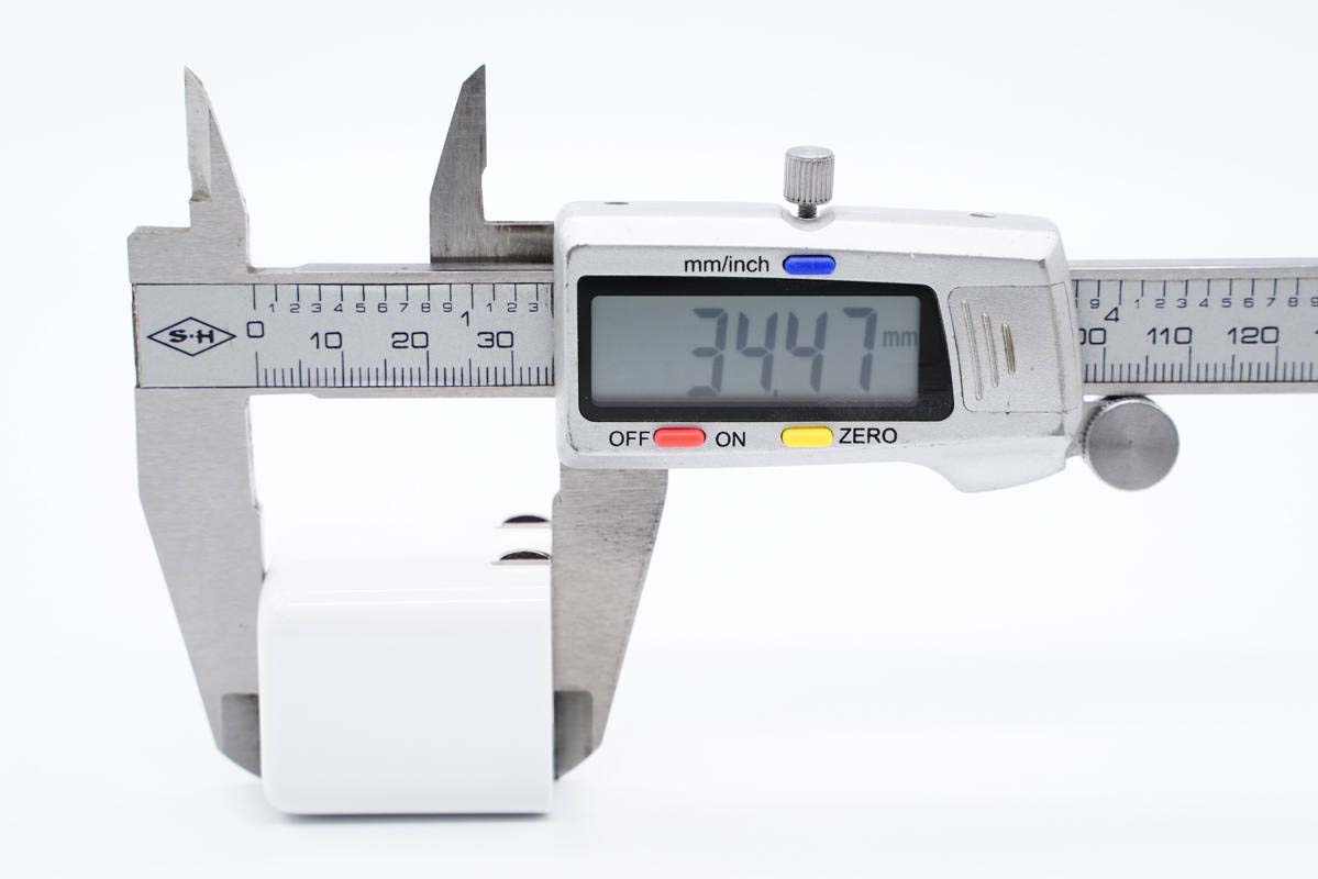 使用游標卡尺實測充電器機身高度為34.47mm。