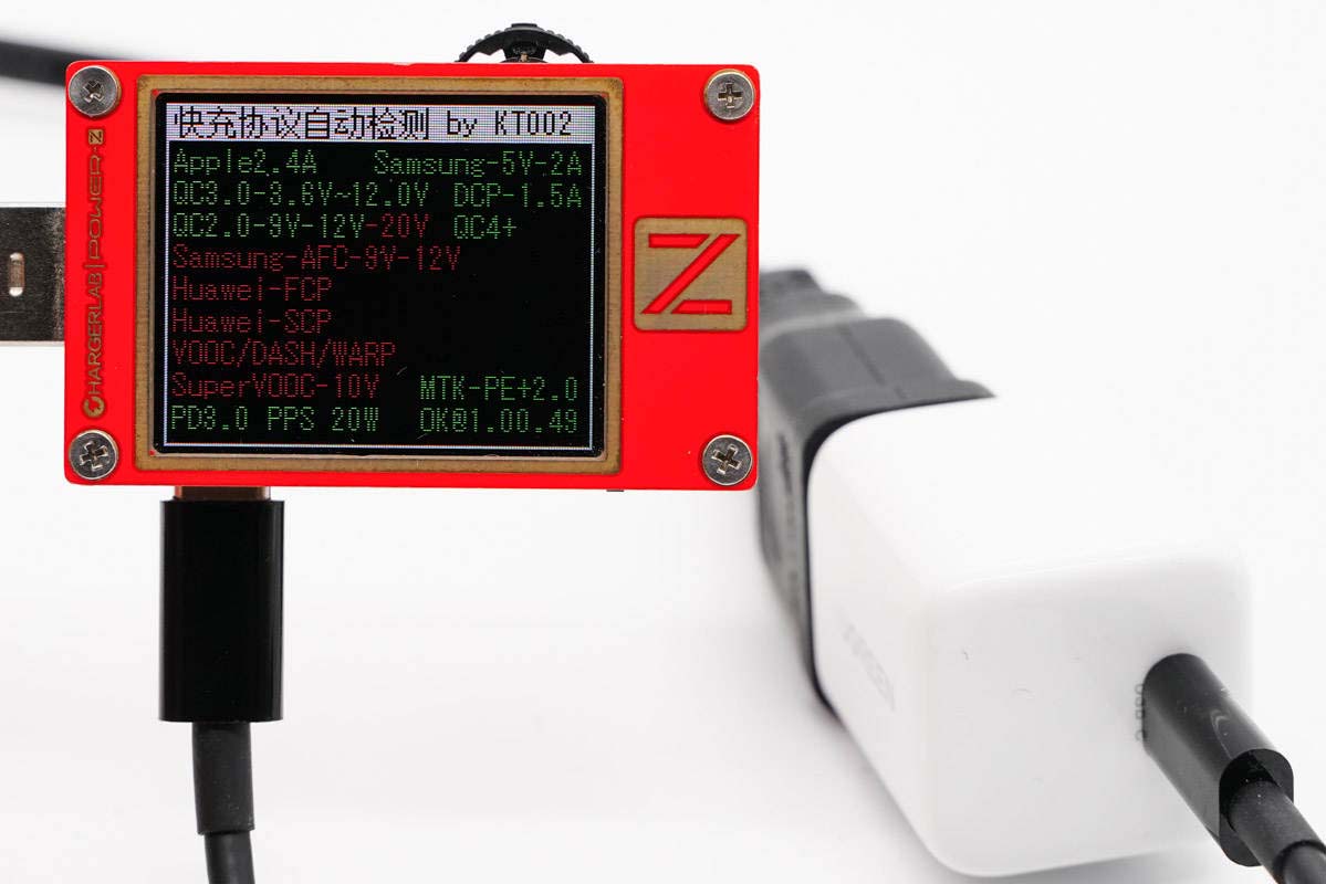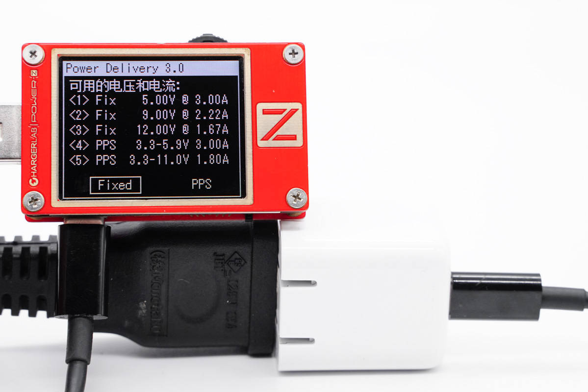使用ChargerLAB POWER-Z KT002測得USB-C口支持Apple 2.4A、Samsung 5V2A、DCP協議,以及QC2.0/3.0、PE2.0、PD3.0、PPS快充協議。