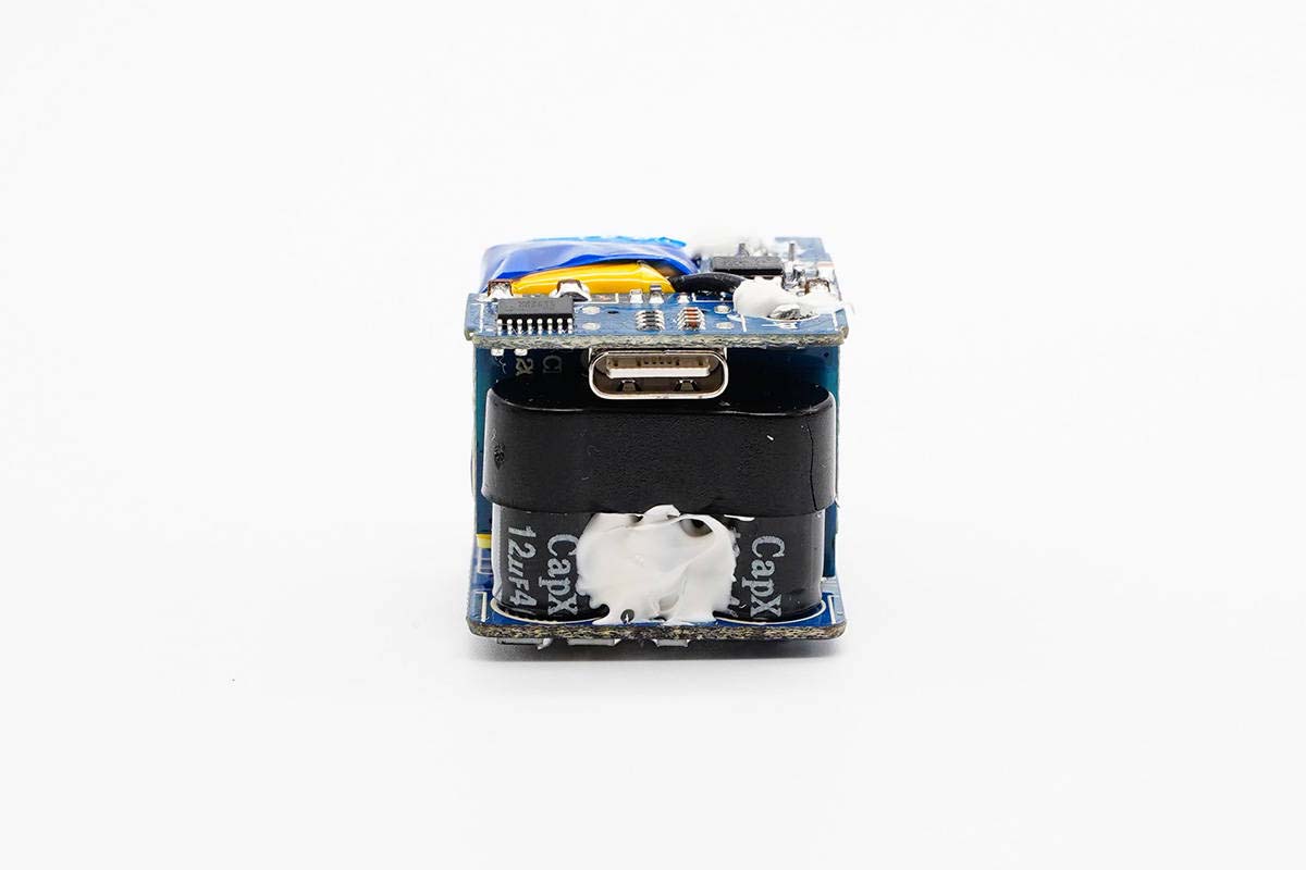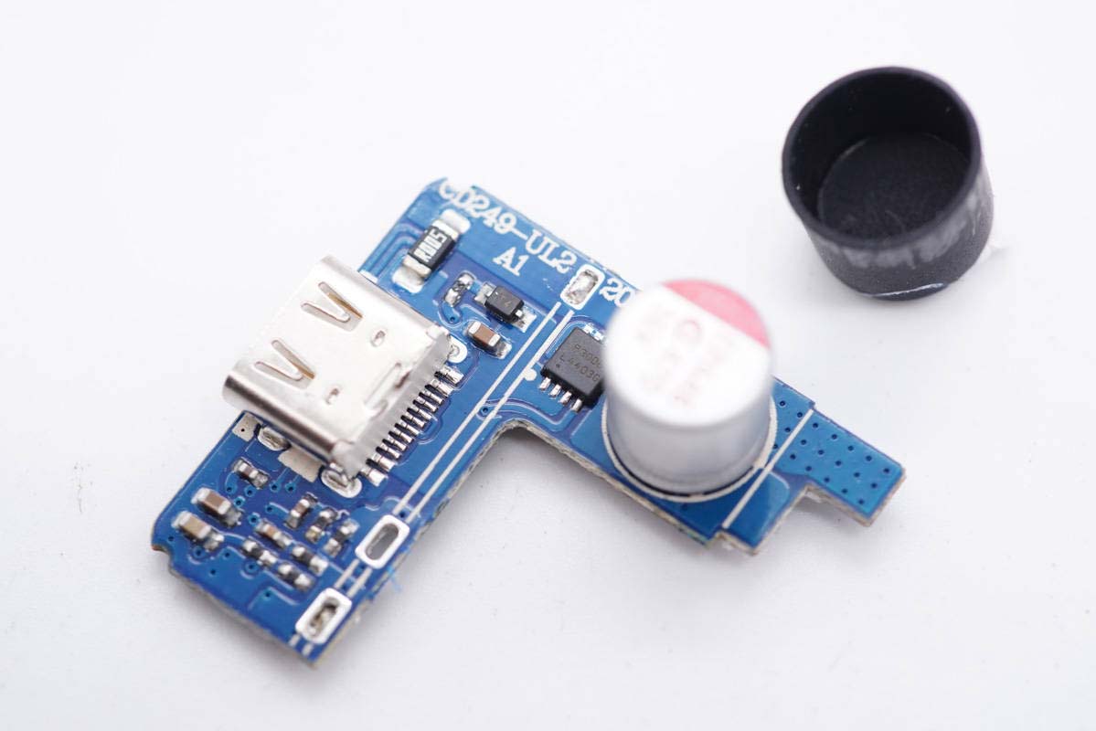 正面設有輸出濾波固態電容和VBUS開關管,電容外套絕緣管。