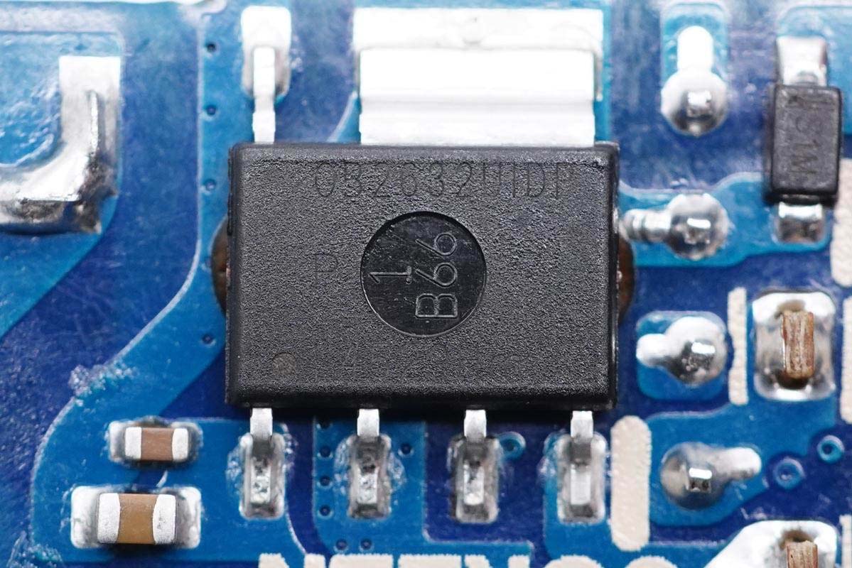 充電頭網通過拆解了解到,充電器內部也是采用熱門的三塊PCB板組合焊接設計,不過是“工”字結構,相對來說會更加穩定些。此外輸出端小板對應變壓器處鏤空處理,可以減小充電器體積。充電器采用昂寶OB2632+OB2004Z+OB2613全套快充解決方案,集成度高,在性能、體積、成本上很有優勢,讓產品更具競爭力。
