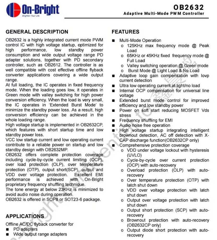 昂寶OB2632詳細資料。充電頭網了解到,采用昂寶OB2632的產品還有飛利浦45W 3A1C多功能轉換插頭、Grandstar 2A1C 61W快充充電器、邦克仕18W PD充電器、ANKER單口30W PD充電器A2014、HELPERS LAB 2A2C 75W快充充電器、京造63W PD三口快充充電器、MOMAX 66W PD充電器等數十款電源產品采用。