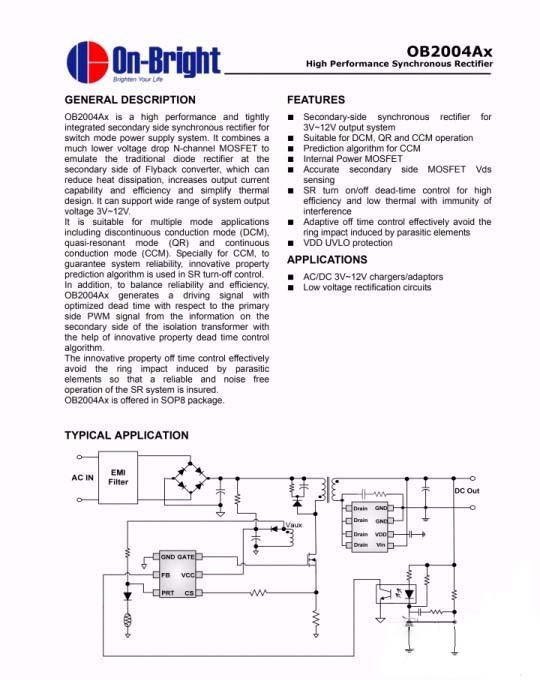 次級同步整流芯片采用昂寶OB2004Z,其內置NMOS,支持3-12V輸出,集成度高。