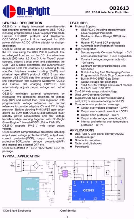 協議IC采用昂寶OB2613,用于支持PD協議和輸出電壓反饋調節。OB2613是昂寶電子開發的一款高精度高集成度的USB PD控制器, 已于2018年11月獲得USB-IF的PD3.0+PPS認證,并于2018年12月通過高通QC4+的測試認證。