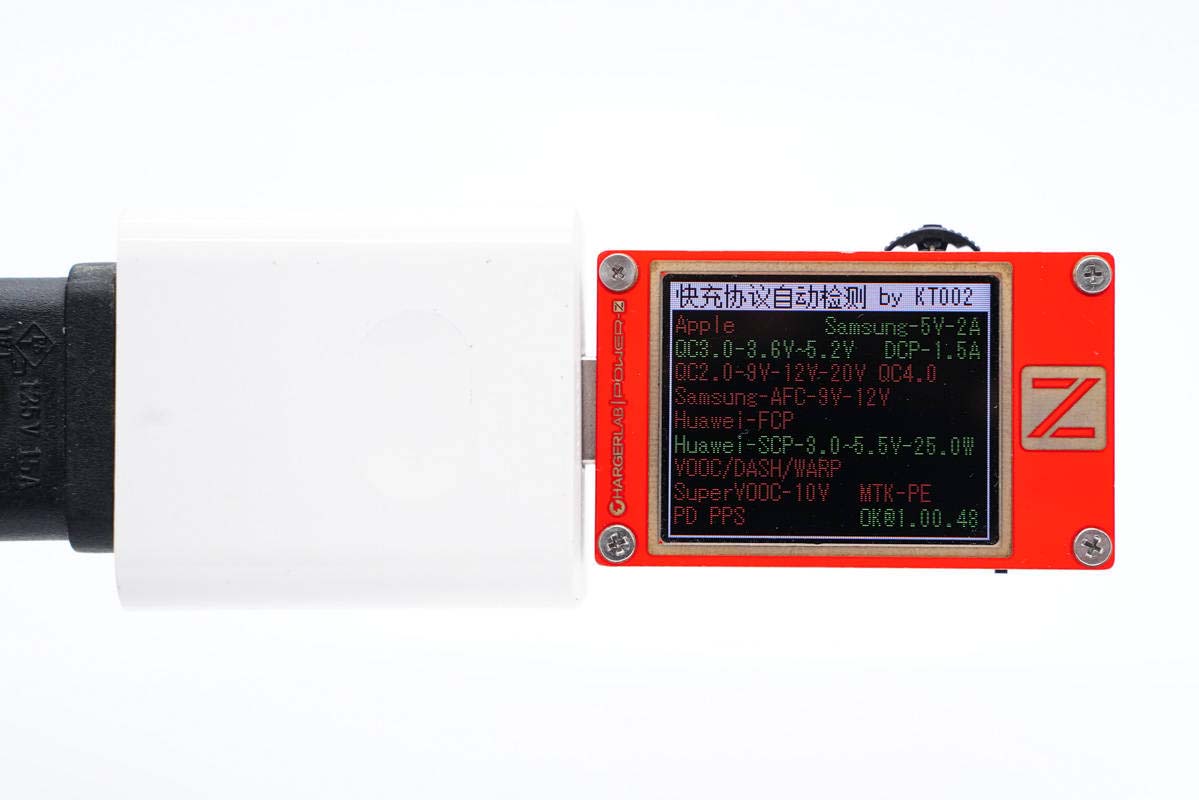 使用ChargerLAB POWER-Z KT002檢測(cè)USB-A口的輸出協(xié)議,顯示支持Samsung 5V/2A、DCP協(xié)議,以及QC3.0、SCP快充協(xié)議。