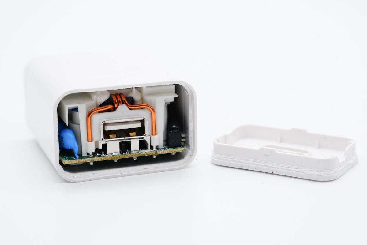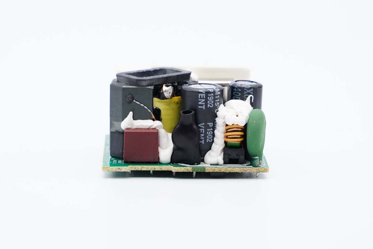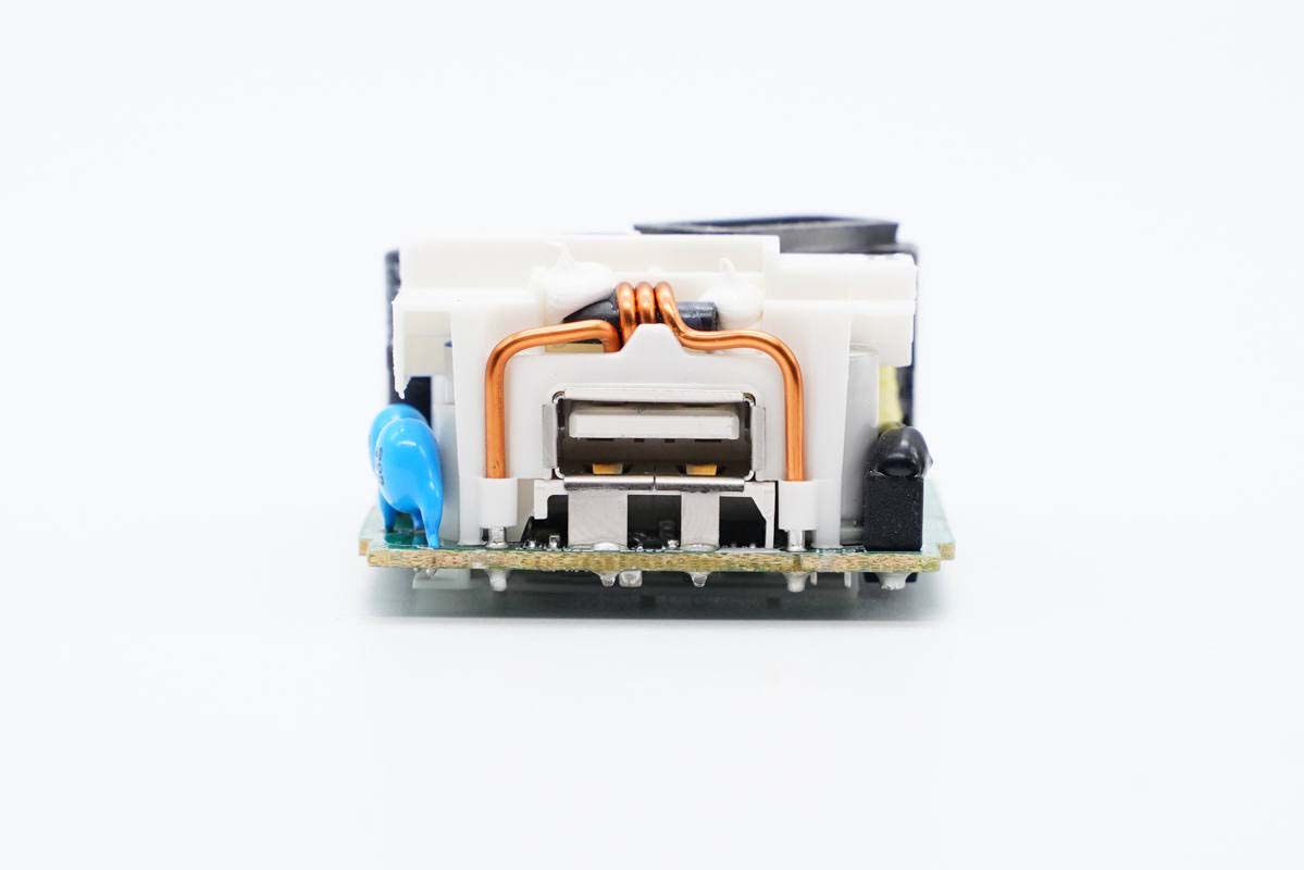 輸出端一覽,USB母座外套塑料殼防塵加固,頂部有銅線繞制的濾波電感,兩側(cè)設(shè)有Y電容和固態(tài)電容。