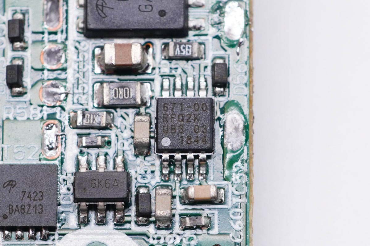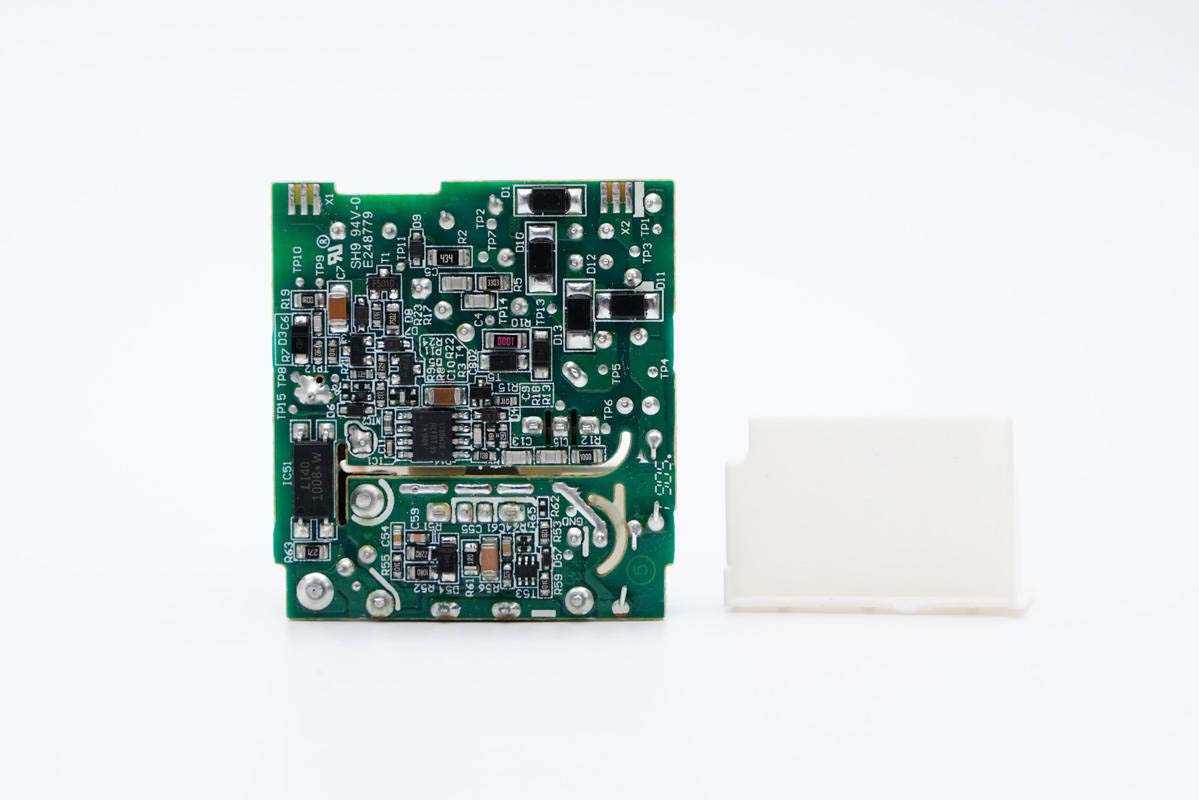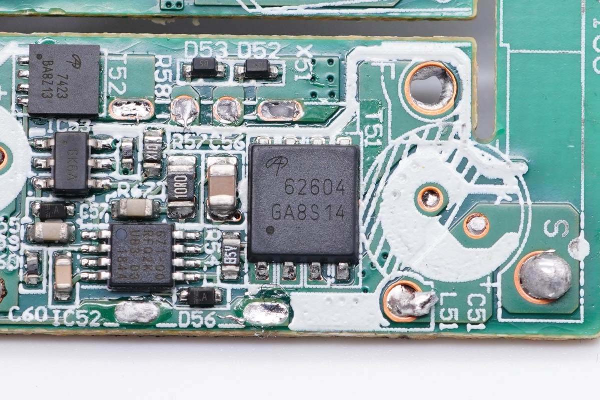 將塑料殼和母座拆掉,下方有同步整流控制器、整流管、協(xié)議IC和輸出VBUS開關(guān)管。