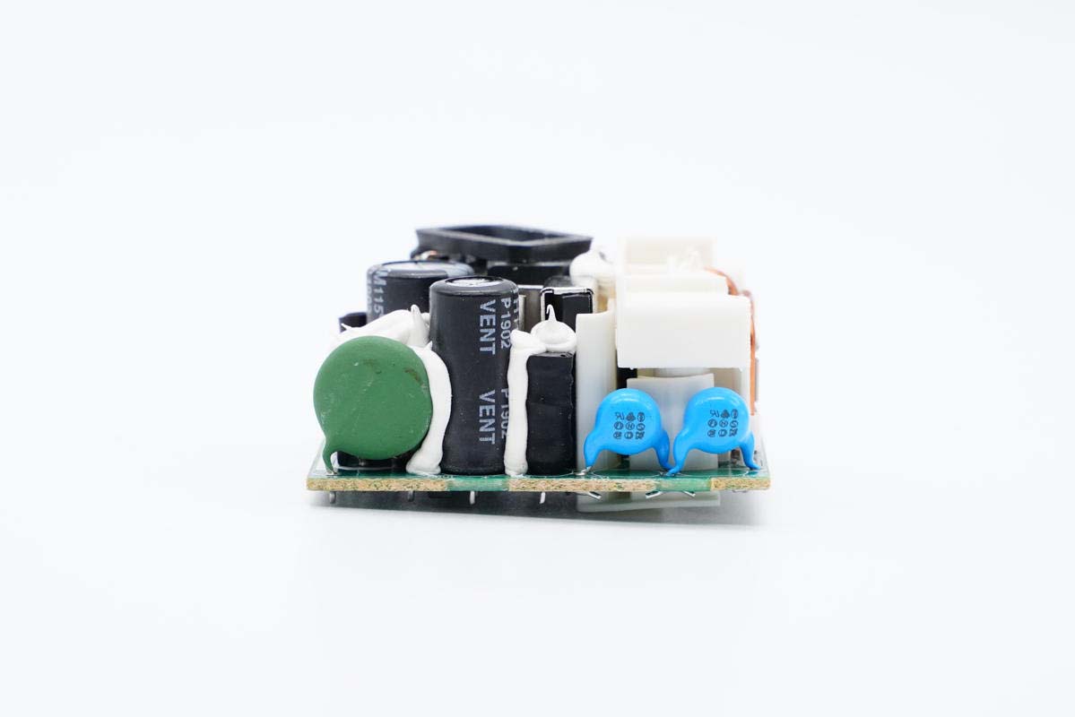 PCB板正面一覽,保險(xiǎn)絲、電容等器件打膠加固,變壓器斜著布置,充分利用空間。初級(jí)開關(guān)MOS管有散熱片幫助散熱,初次級(jí)之間有白色塑料殼隔離。