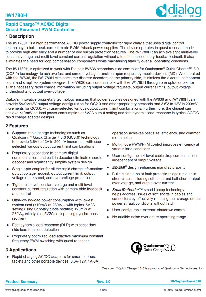 Dialog iW671,數(shù)字綠色模式同步整流控制器。