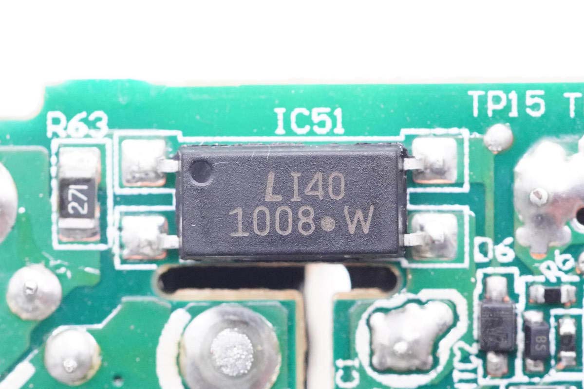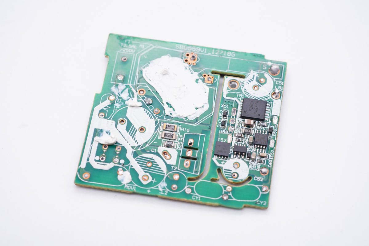 PCB板背面一覽,初次級(jí)之間鏤空以穿過塑料隔離板,右上角四顆二極管組成橋式整流,此外背面還有PWM主控芯片和光耦。