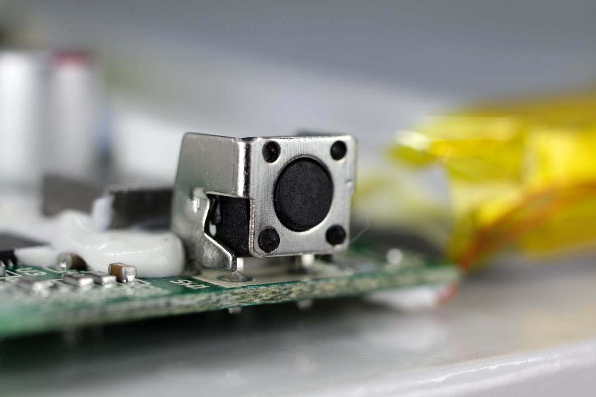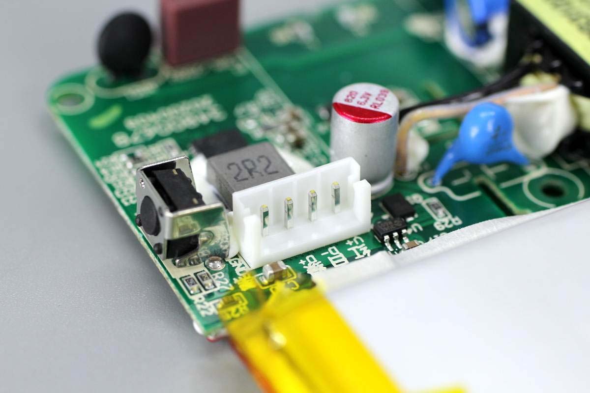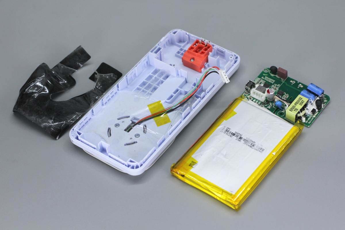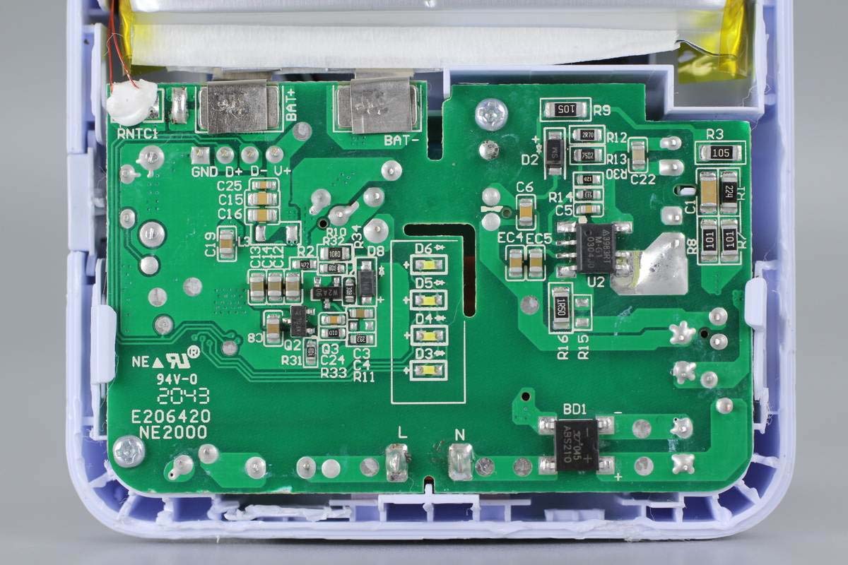 PCB板使用螺絲固定,和電芯通過鎳片點焊連接。板子中間設有LED指示燈,右側是充電器電路,可以看到有整流橋和主控芯片。