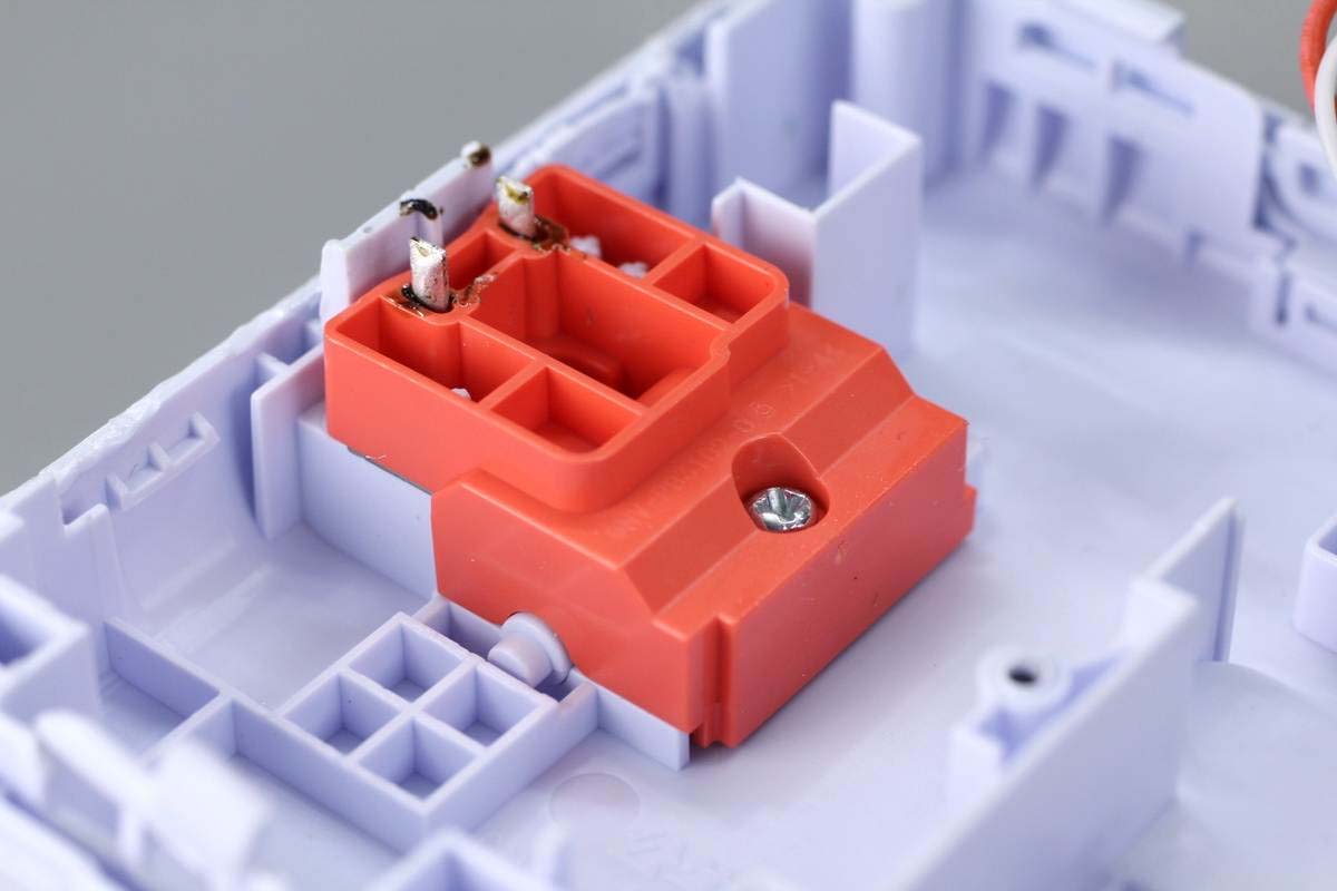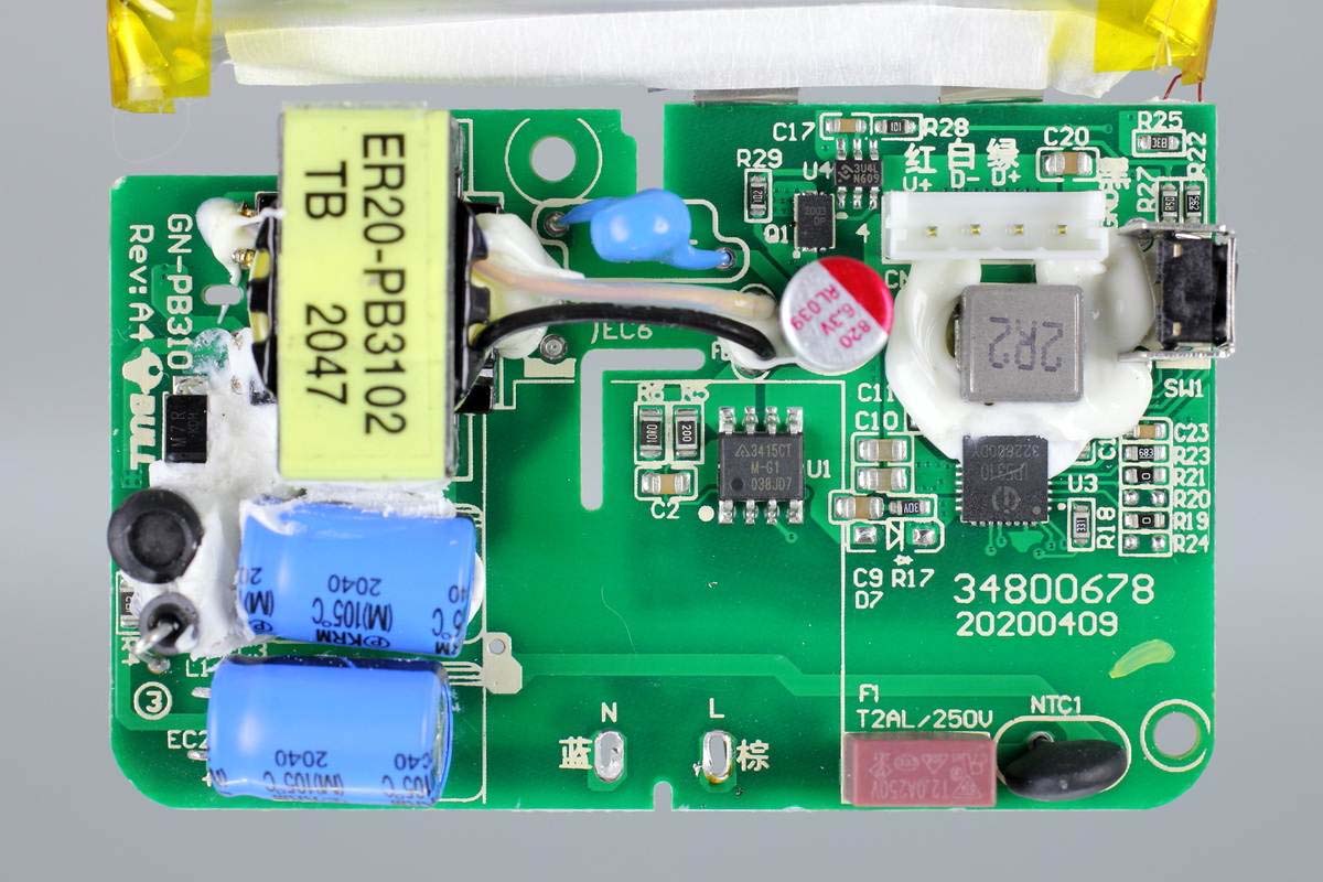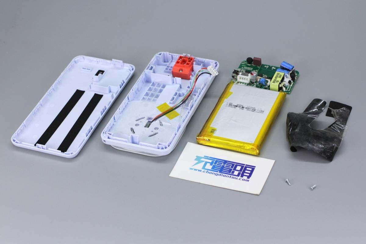 拆掉螺絲取出電芯和PCB板,另一半機身殼上也貼有保護泡棉,此外AC插腳區域貼有絕緣膠帶,連接導線采用插拔式設計,組裝方便。