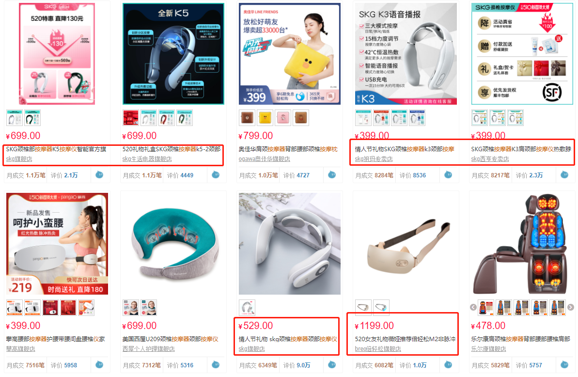 兩大主要線上平臺的搜索之后,我發(fā)現(xiàn)似乎肩頸按摩儀的品牌雖然多,但是似乎只有SKG和倍輕松是“頂流”?