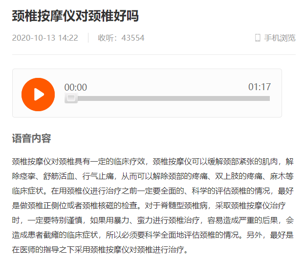 筆者在網(wǎng)上一些問醫(yī)平臺找到相關的頸部按摩儀問答,作用、效果以及副作用都非常詳盡、專業(yè),大家可以引為參考。