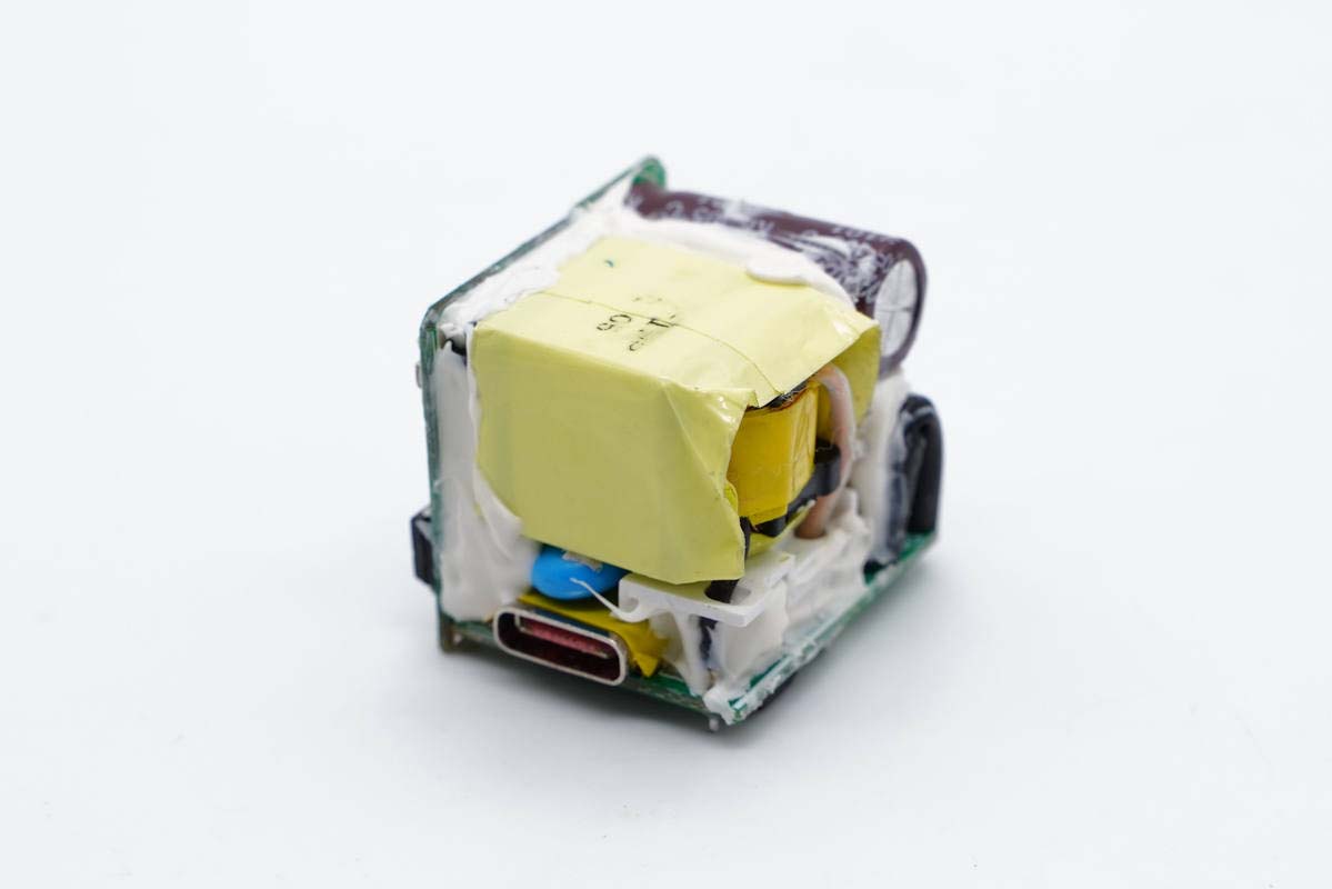 充電頭網(wǎng)通過拆解了解到,充電器PCBA模塊由兩塊小板組成,通過小板組合的結(jié)構(gòu),將元器件布置在這么小的空間內(nèi)。初次級間設(shè)有隔離板進行隔離,USB母座還粘貼膠帶加強絕緣。此外元器件間打膠填充固定,保證整體穩(wěn)定性,做工講究。