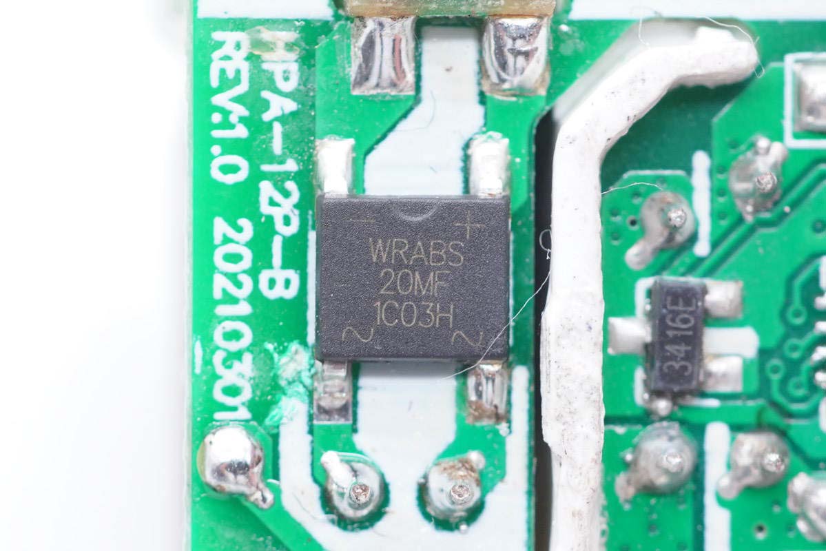 小板背面初次級間鏤空穿過隔離板,初級側(cè)設(shè)有一顆整流橋,次級側(cè)有同步整流芯片和協(xié)議芯片,集成度高外圍電路相當簡潔。