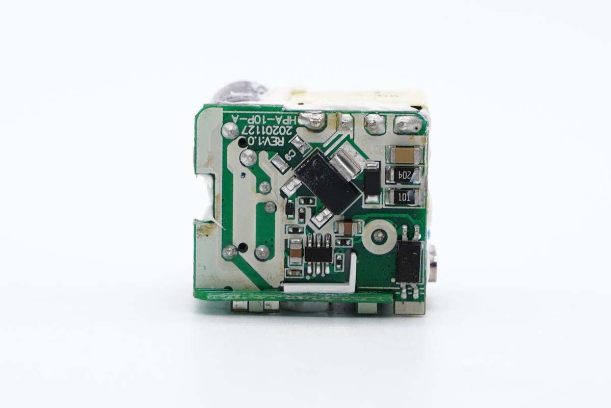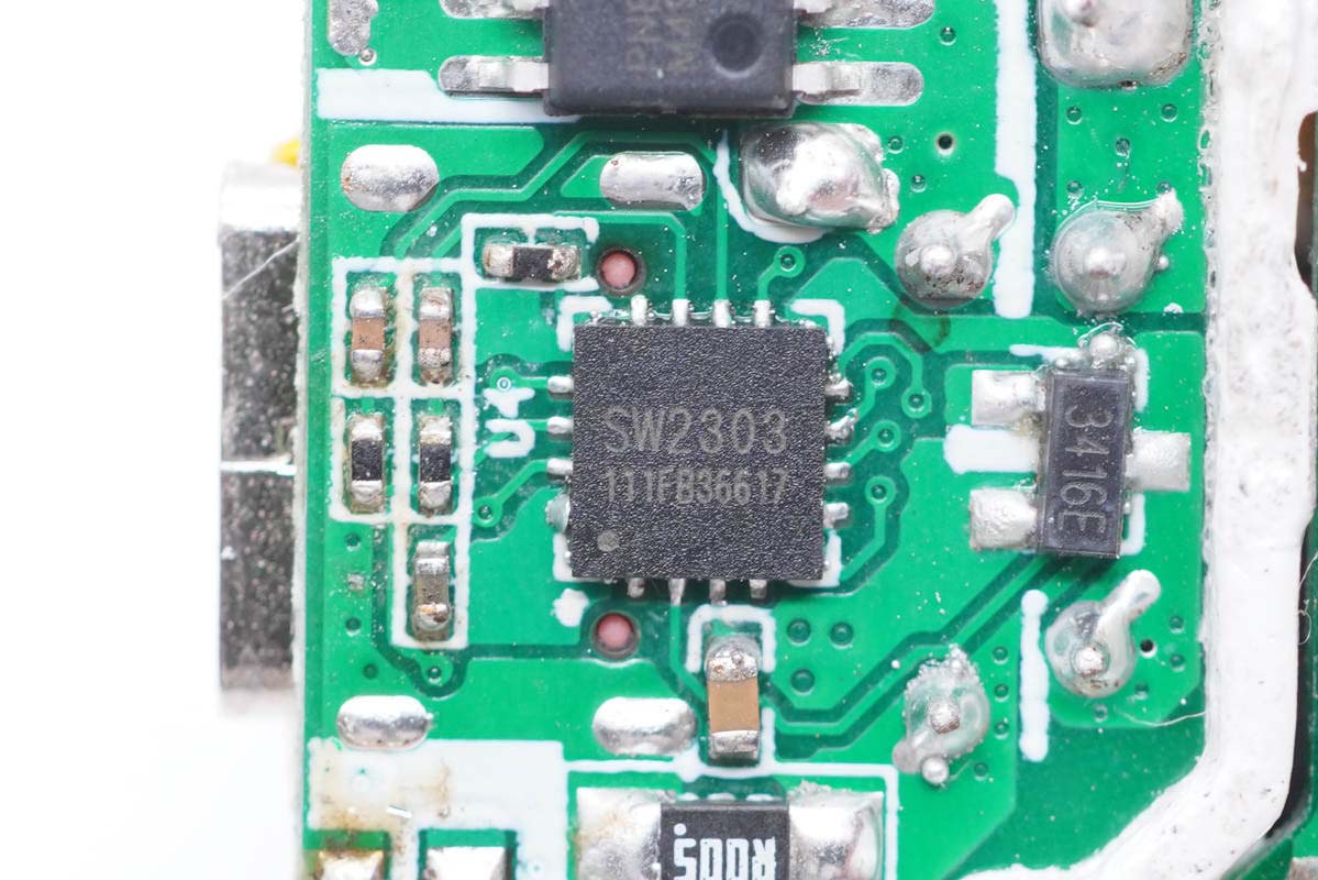 充電器采用了芯朋微AP8268+PN8309H快充方案,以及智融高通QC5認證協(xié)議芯片SW2303,整體集成度很高。可以看到高集成的加持下,產(chǎn)品外圍電路變得非常簡潔,對產(chǎn)品小型化以及降低系統(tǒng)成本非常有幫助。同時采用永銘小體積電解電容和固態(tài)電容進行濾波,對壓縮體積也很有幫助,因此造就了這么一款小巧的迷你充。