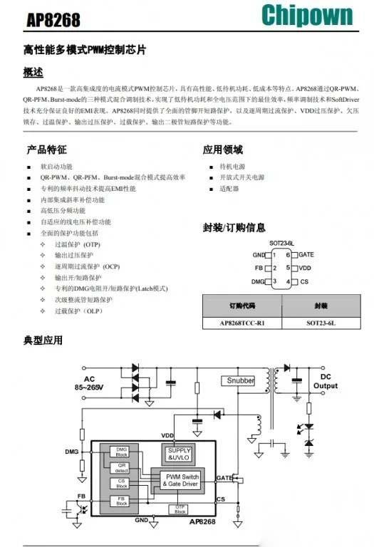 充電器主控芯片絲印69M50,實際是芯朋微AP8268。這是一款高集成度的電流模式PWM控制芯片,具有高性能、低待機功耗、低成本、多重保護等特點。其通過QR-PWM、QR-PFM、Burst-mode的三種模式混合調(diào)制技術(shù),實現(xiàn)了低待機功耗和全電壓范圍下的最佳效率,頻率調(diào)制技術(shù)和SoftDriver技術(shù)充分保證良好的EMI表現(xiàn)。