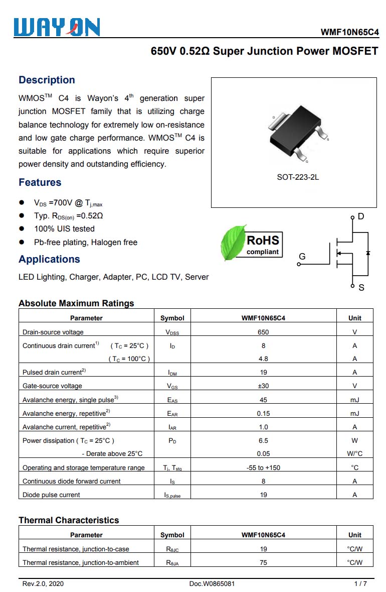 初級開關(guān)MOS管來自維安,型號WMF10N65C4。超結(jié)NMOS管,耐壓650V,導阻0.52Ω,SOT223封裝。