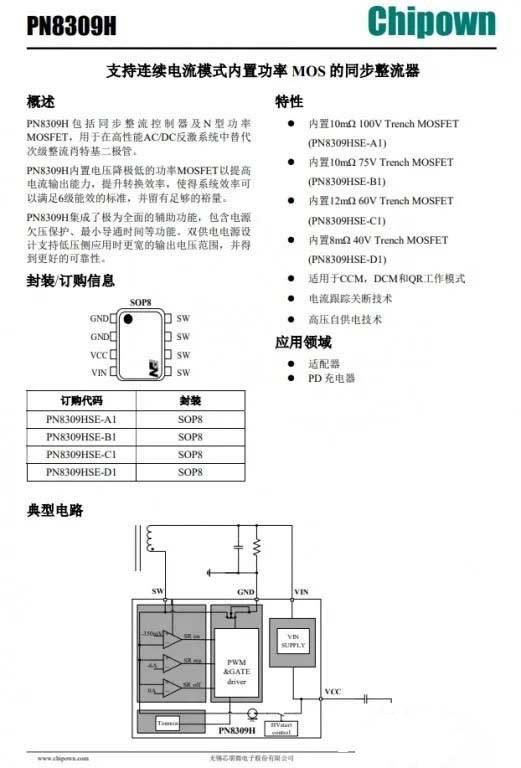 同步整流芯片采用芯朋微PN8309H,內(nèi)置同步整流控制器及N型功率MOSFET,用于在高性能AC/DC反激系統(tǒng)中替代次級整流肖特基二極管;內(nèi)置電壓降極低的功率MOSFET以提高 電流輸出能力,提升轉(zhuǎn)換效率,使得系統(tǒng)效率可以滿足6級能效的標準,并留有足夠的裕量;集成了極為全面的輔助功能,包含電源欠壓保護、最小導通時間等功能。