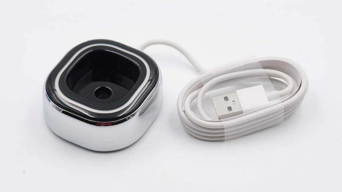 無線充底座自帶USB-A輸入線纜,機(jī)身整體亮面處理,光滑圓潤(rùn),側(cè)身套有鋁制金屬殼。