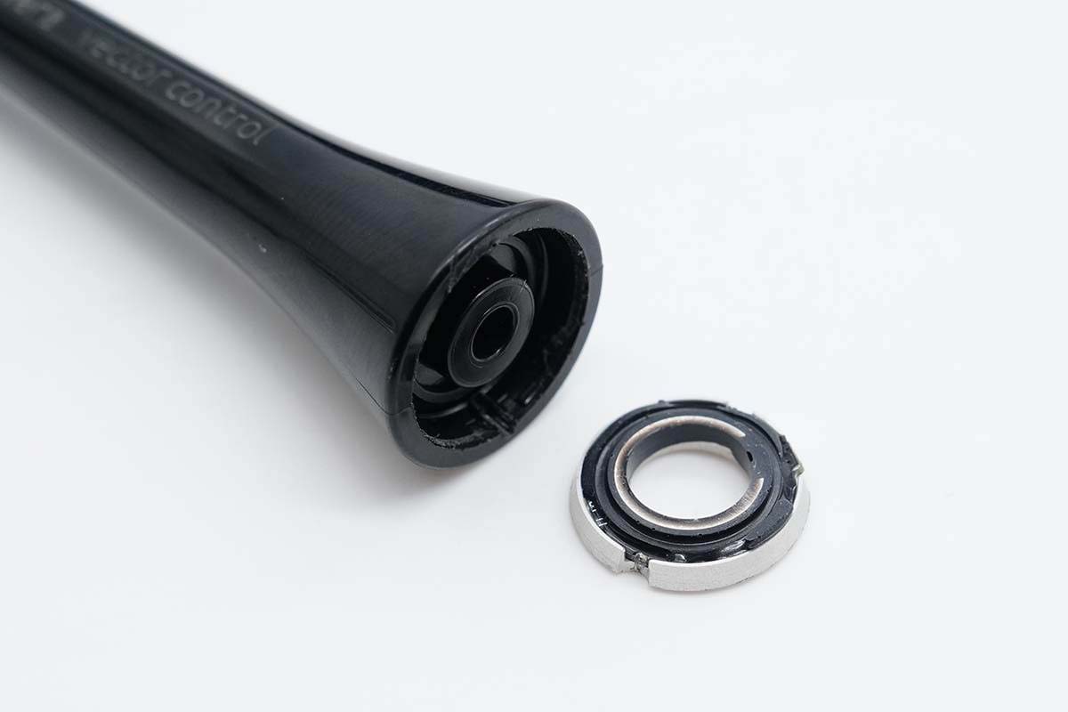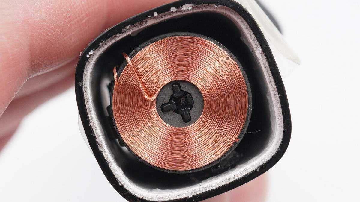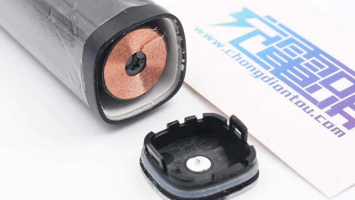 拆下刷頭封膠固定的底部金屬壓環(huán),可以看見緊貼壓環(huán)部分有一圈感應(yīng)線圈。
