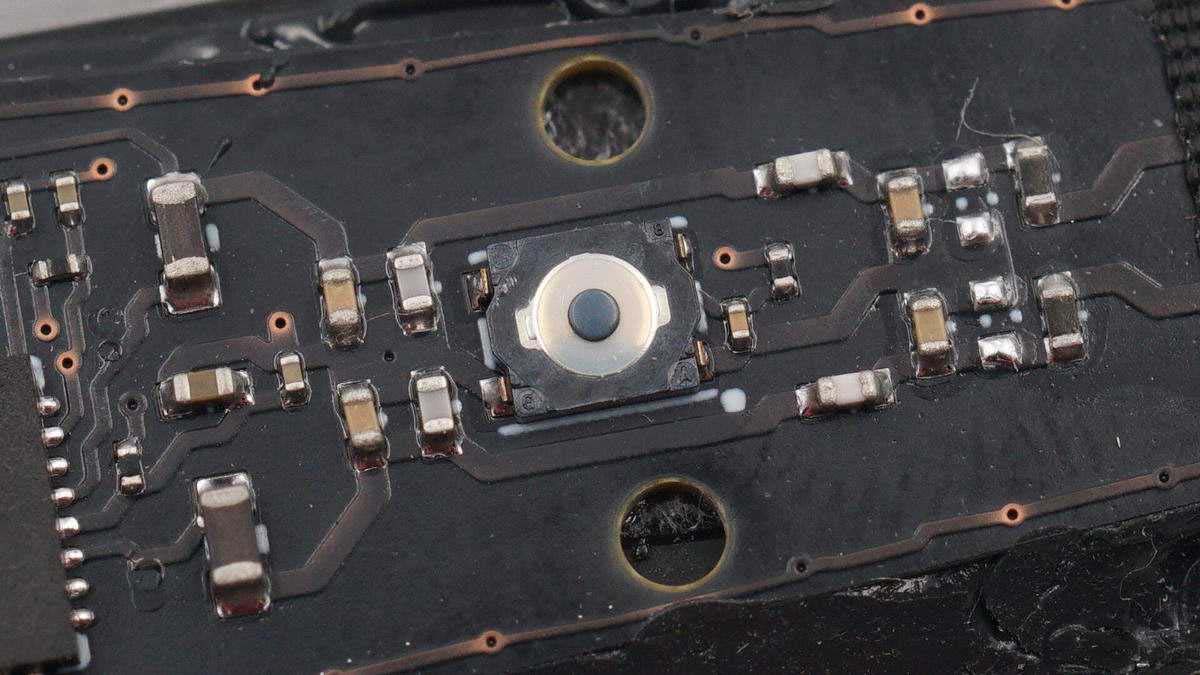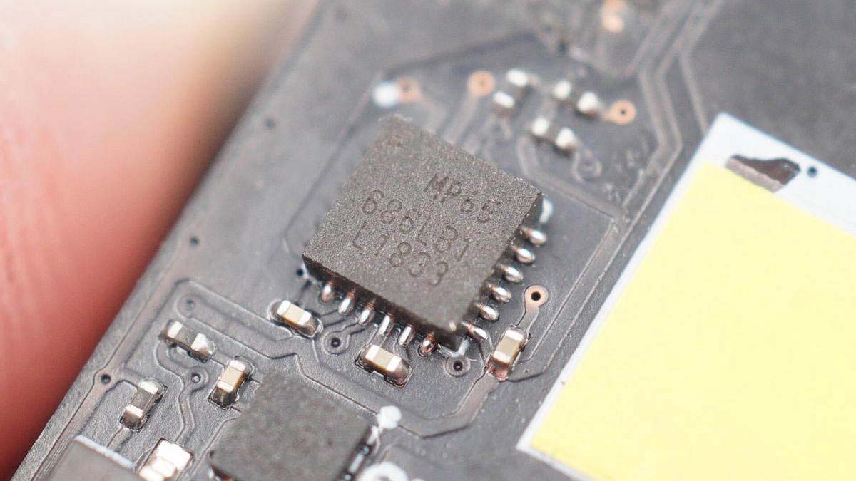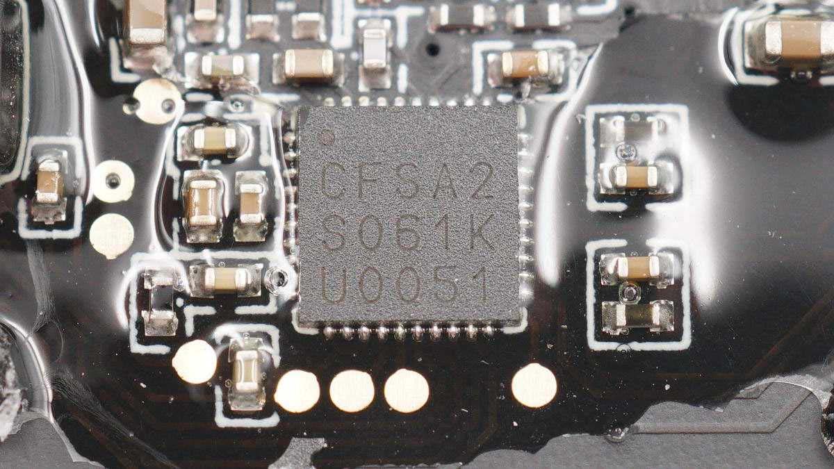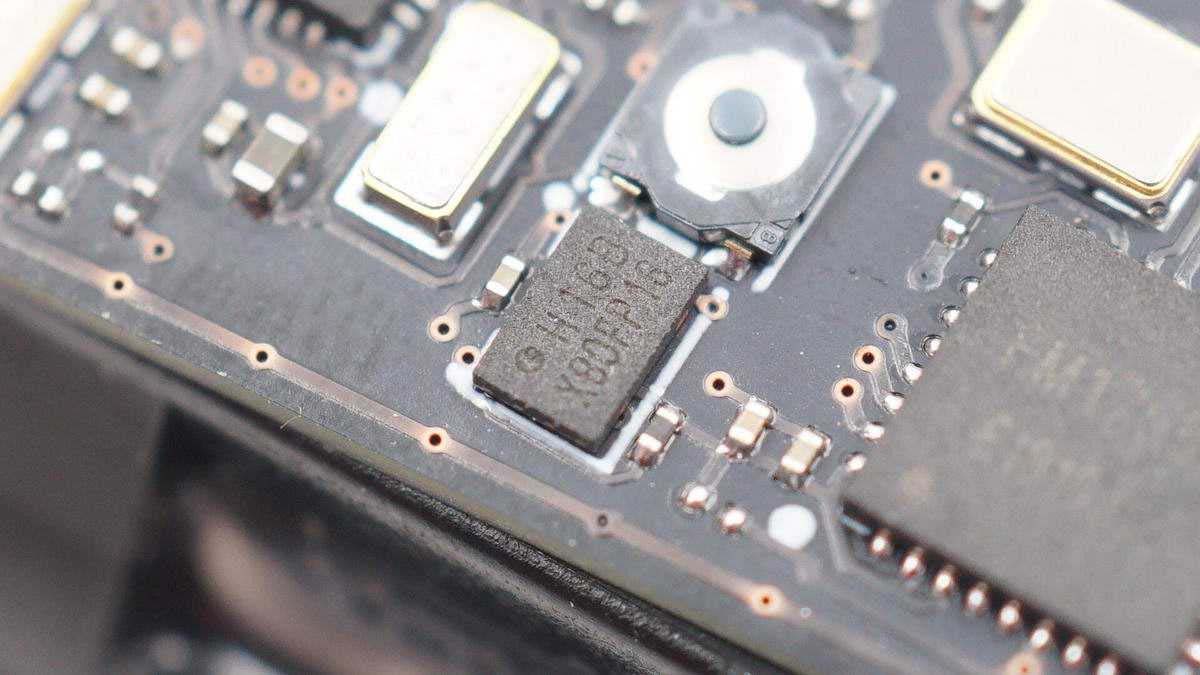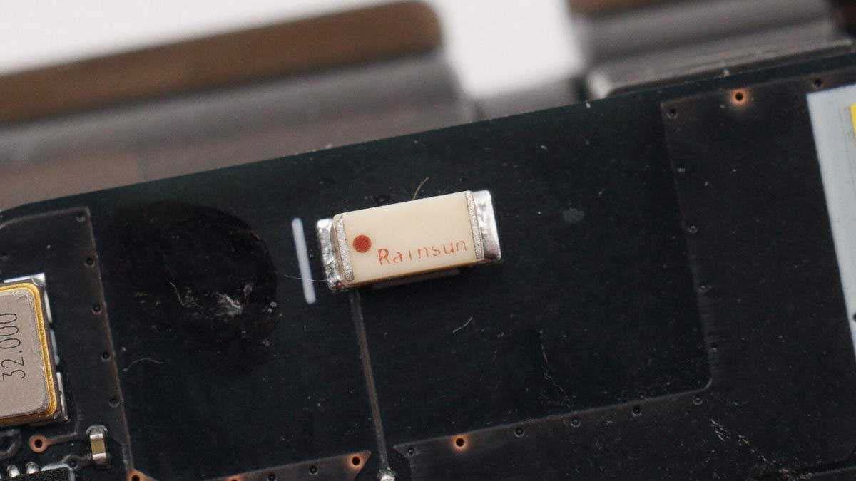 將防水膠清理掉,可以看到有存儲(chǔ)芯片、無線充主控芯片、兩顆MOS管以及諧振電容,電容打膠固定。板子另一面有無線充電線圈,不過為了極致防水,內(nèi)部使用硬封膠填充成一個(gè)整體,板子沒法拆下來。