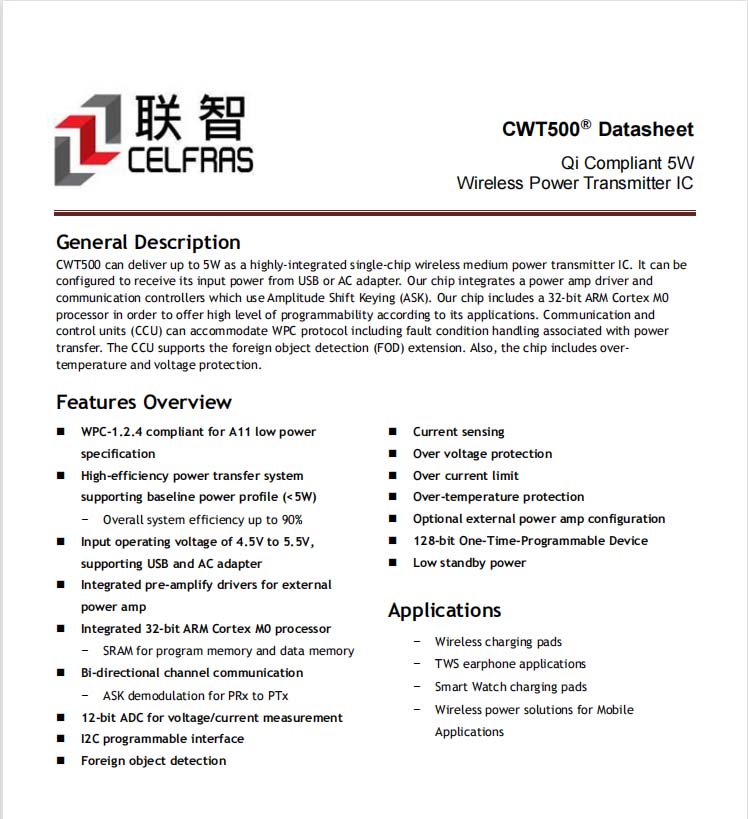 無線充電SOC主控芯片采用江西聯(lián)智的CWT500,是一顆可提供高達(dá)5W功率的高集成單芯片無線充電發(fā)射IC。支持USB和適配器輸入;還集成了MOS管驅(qū)動(dòng)器,兼容QI協(xié)議使用ASK和FSK的通信控制器。