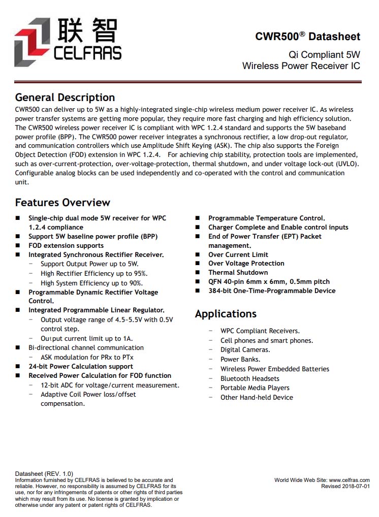 無線充接收器也是來自江西聯(lián)智,型號(hào)CWR500。用于無線充電接收,內(nèi)置整流管,電路集成度高,固定5V輸出。