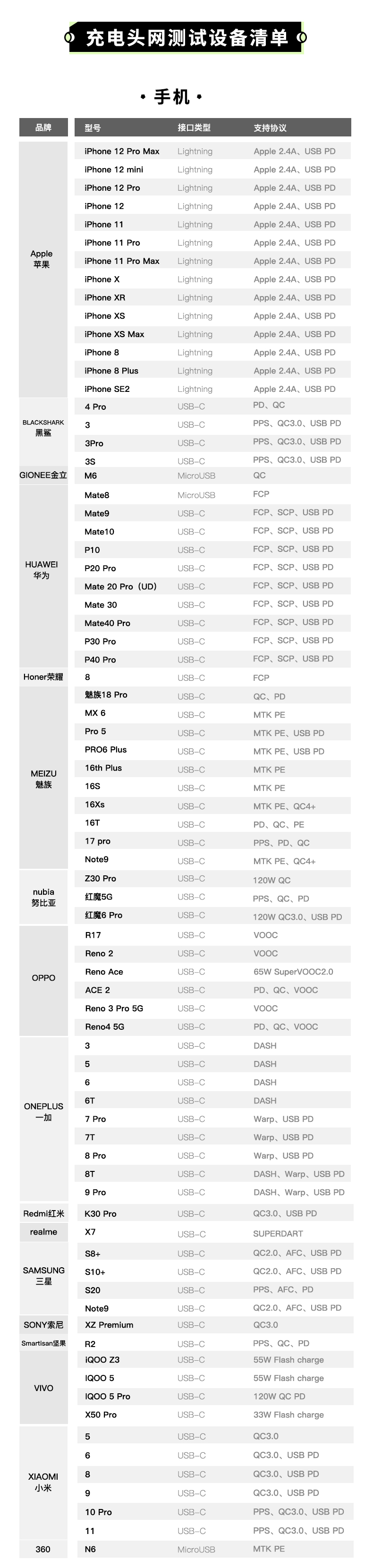截止到目前,充電頭網評測室共計有手機近 80 余部,品牌覆蓋Apple 蘋果、BLACKSHARK 黑鯊、GIONEE 金立、HUAWEI 華為、HONOR 榮耀、MEIZU 魅族、nubia 努比亞、OPPO 歐泊、ONEPLUS 一加、Redmi 紅米、realme 真我、SAMSUNG 三星、SONY 索尼、Smartisan 堅果、vivo 維沃、XIAOMI 小米、360 等機型。