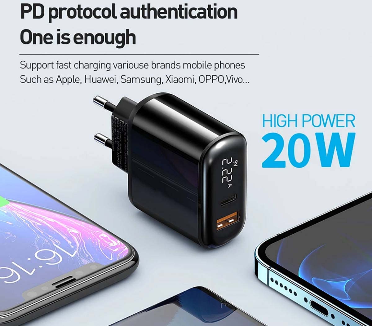 這款同樣配備1A1C接口以及LED數顯屏,接口可智能識別5V、9V、12V電壓電流,為設備選擇恰當的充電功率,不傷電池,最大輸出功率可分別達到20W和18W;支持多種充電協議,能為多種品牌電子產品充電;QC3.0和PD雙快充協議保證了充電速度,充電更快更安全;LED顯示屏實時觀察快充充電功率。