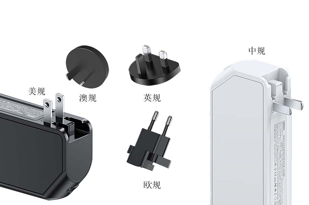 即可用作充電寶,也能當成插座。支持100-240VAC電壓輸入。雙輸出接口支持QC、AFC、FCP、SCP、PE2.0、PD、PPS等主流快充協議,可兼容市面上絕大多數品牌設備 ,支持歐規、美規、英規、澳規、中規等多種轉接頭。