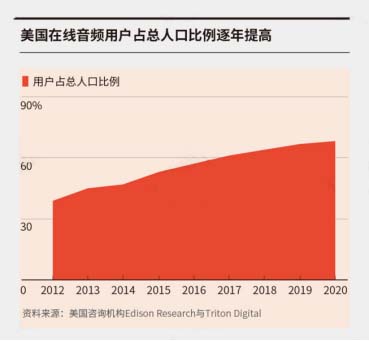 艾媒咨詢數據顯示,從2015年到2019年中國在線音頻市場用戶規模已經從1.95億增至4.89億,預計2020年已達5.42億。美國咨詢機構Edison Research與Triton Digital自1998年以來就調研美國數字媒體市場,他們預計,2021年,美國在線音頻市場的用戶規模將達到1.93億人,占美國總人口的比例從2015年的53%提升至2021年的68%。