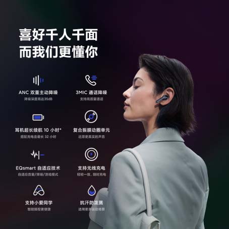 自研的EQsmart技術可以讓耳機的日常使用更加智能化,超低延時得到進一步優化,另外搭配超長使用時間(非降噪模式聽歌續航單次可以達到10小時),疾速閃充(充電5分鐘就可以非降噪模式下持續聽歌2小時),旨在提升品牌消費者無線聽覺的真實體驗。