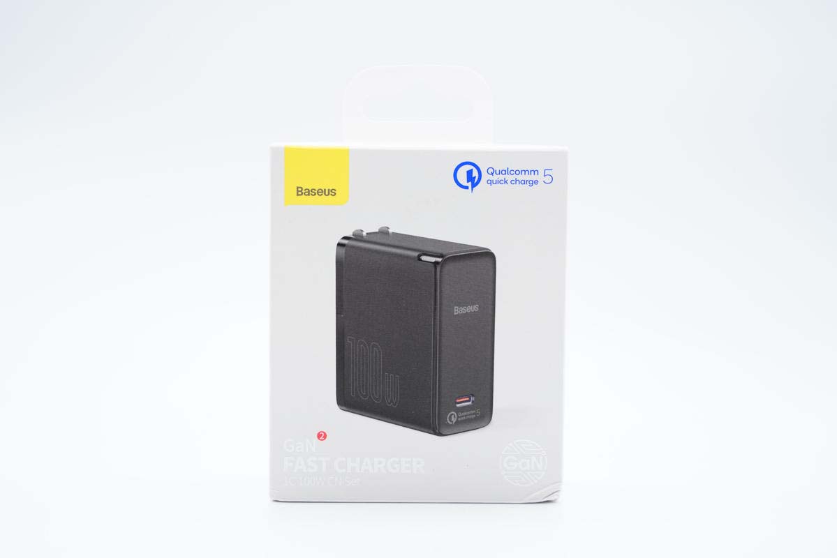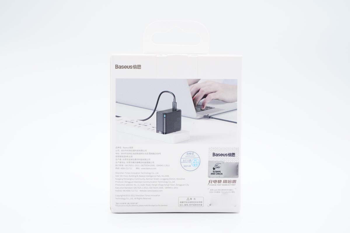 包裝盒正面中心印有充電器外觀圖,上方印有倍思品牌和QC5標(biāo)識(shí),下方印有充電器名稱和GaN標(biāo)識(shí)。