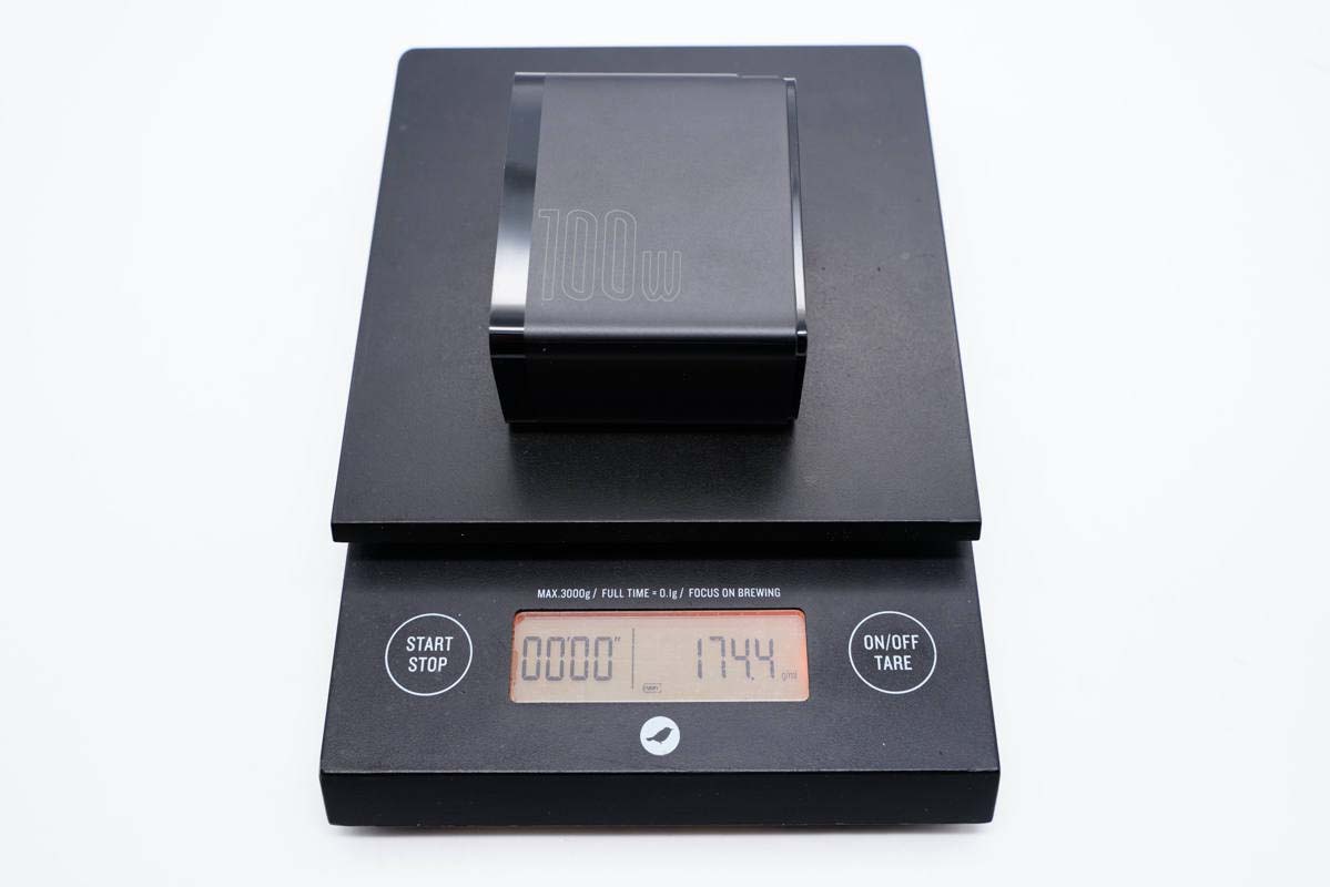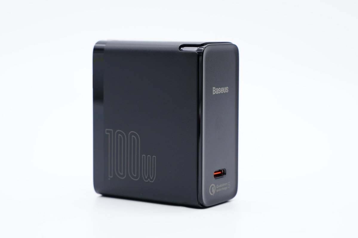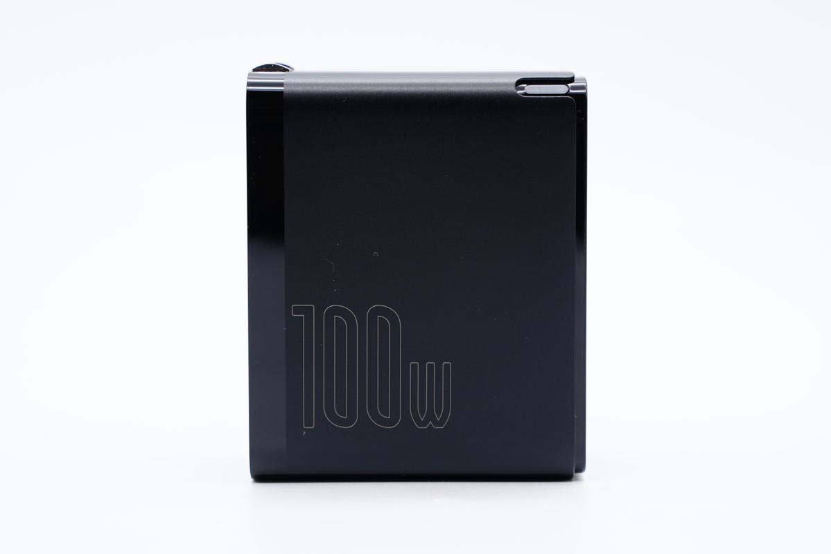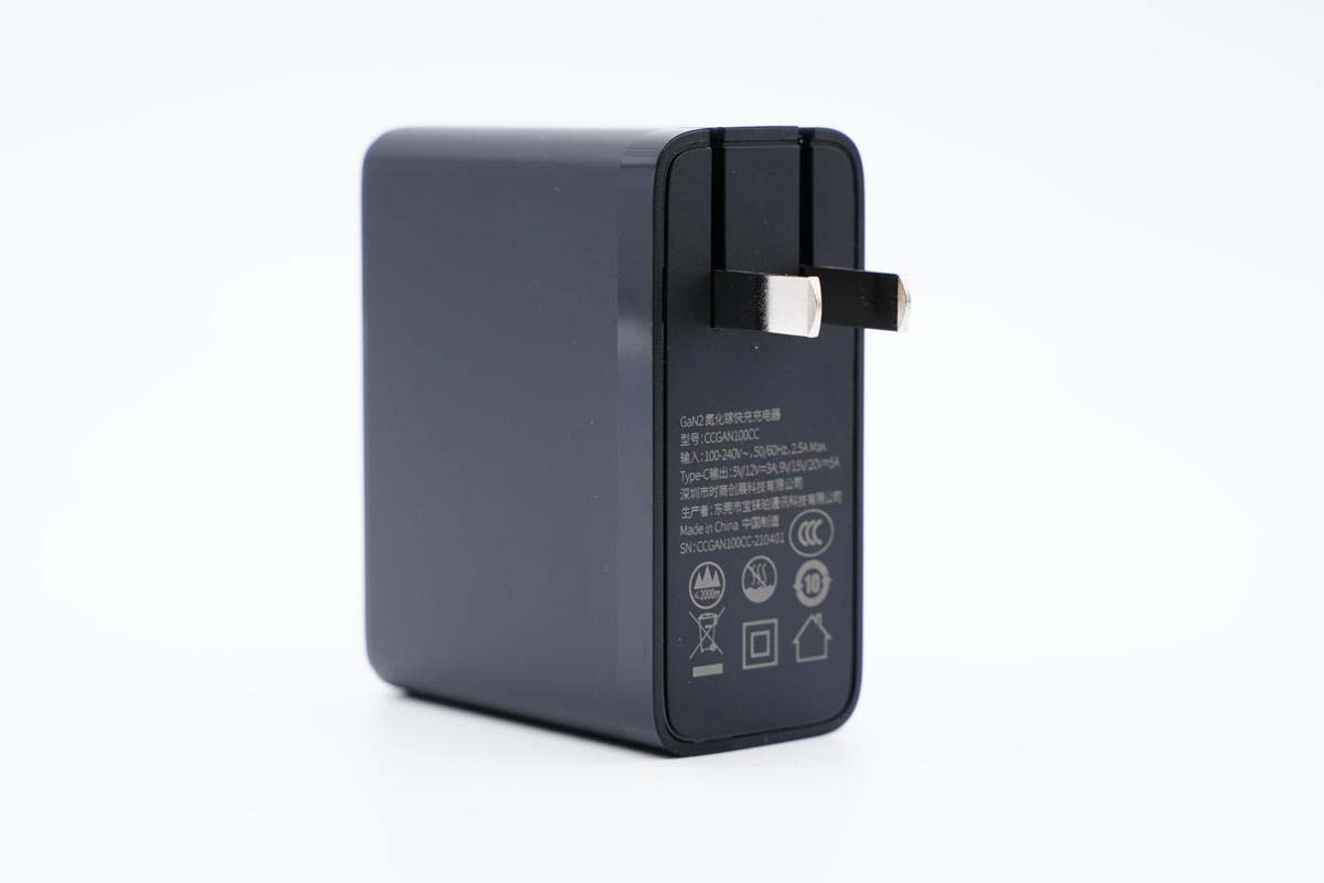 輸入端為切面,腰身靠近輸入端區(qū)域亮面處理,輸出端小一圈設(shè)計(jì)。機(jī)身上印有100W字樣,特殊字體沿用倍思家族ID設(shè)計(jì)。