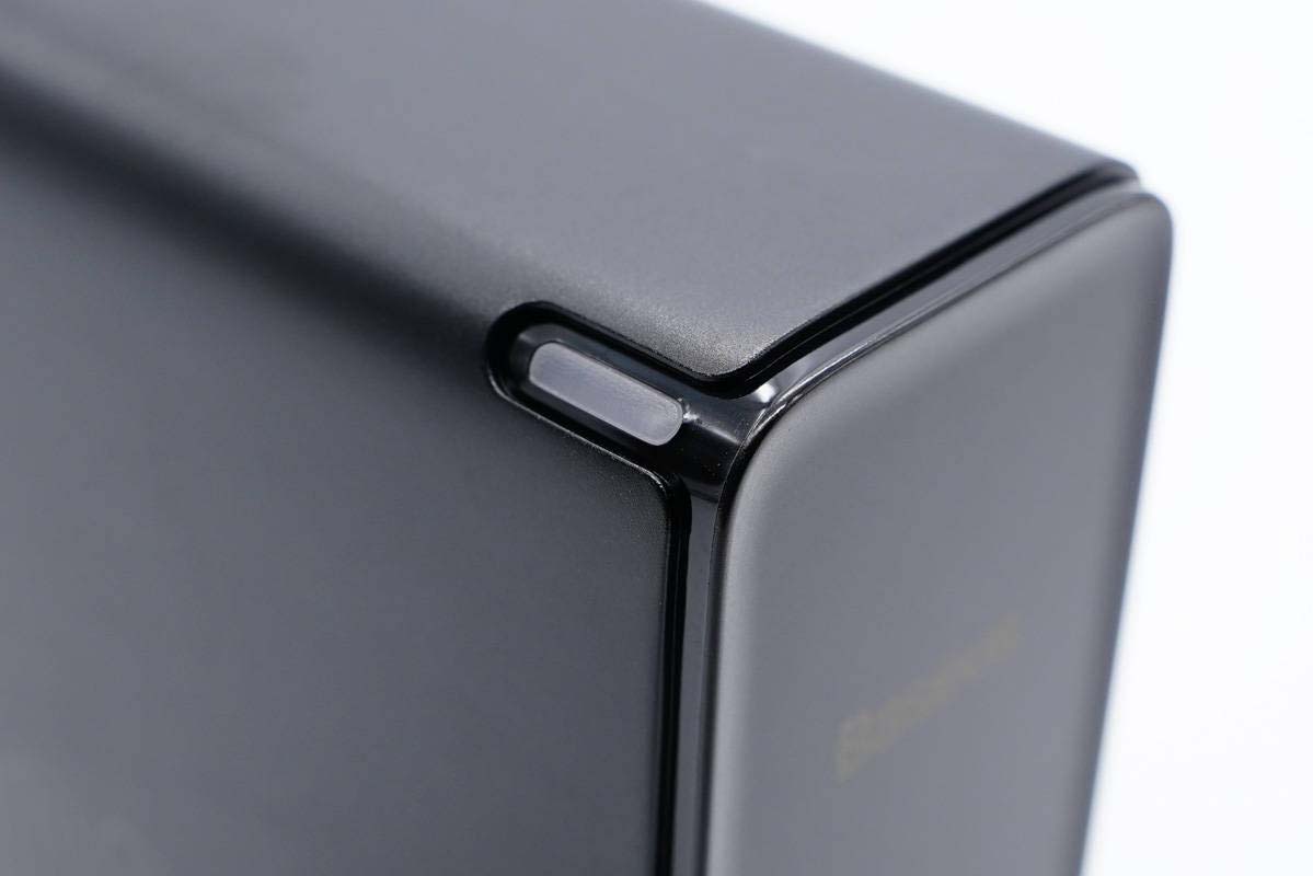 倍思這款100W氮化鎵充電器采用PC阻燃材質(zhì)黑色外殼,腰身表面主要啞光處理,上下端棱邊為光滑弧面過(guò)渡。