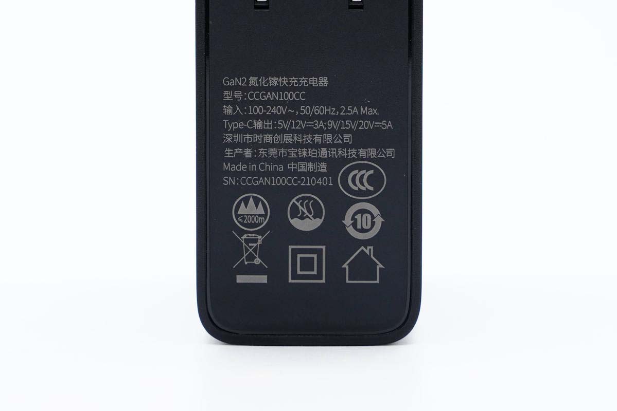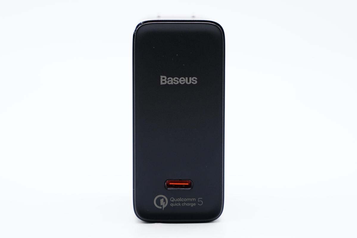 輸出端配有一個(gè)USB-C接口,此外印有Baseus品牌和QC5快充標(biāo)識(shí)。
