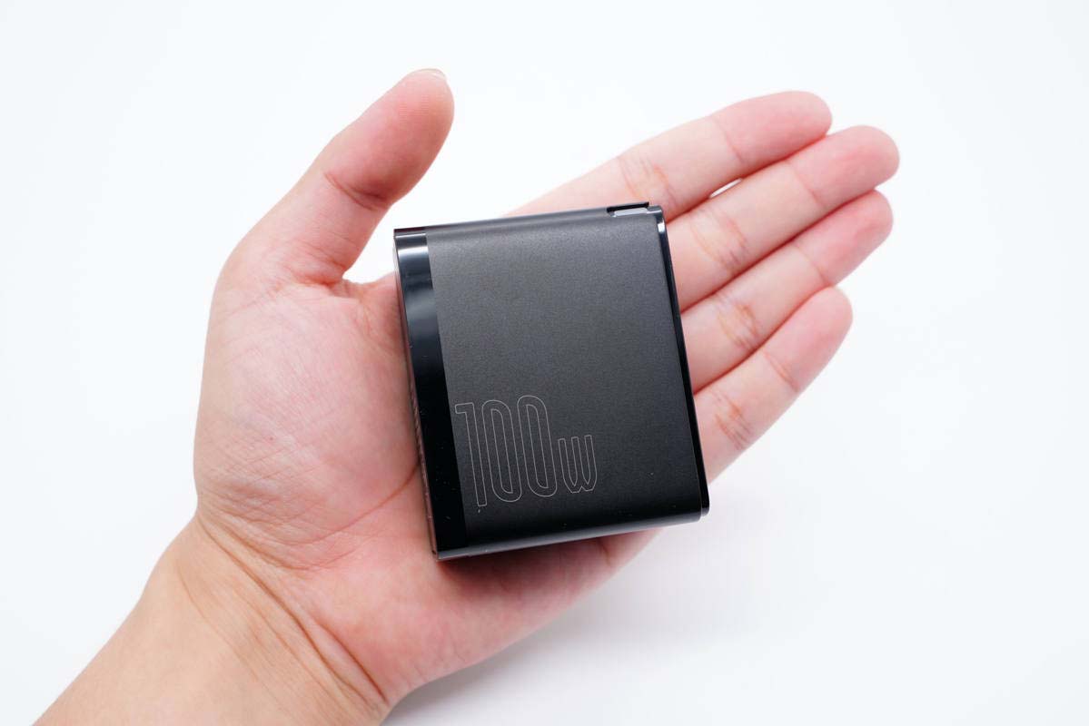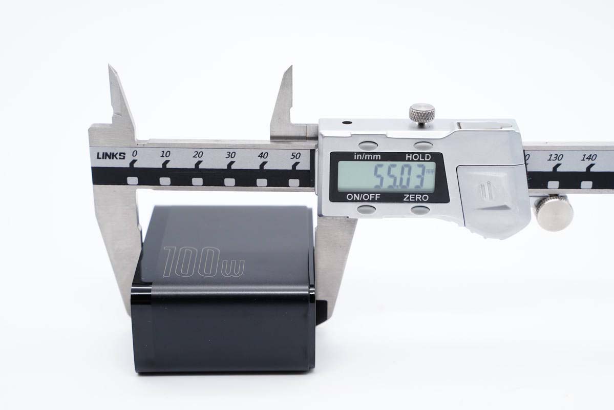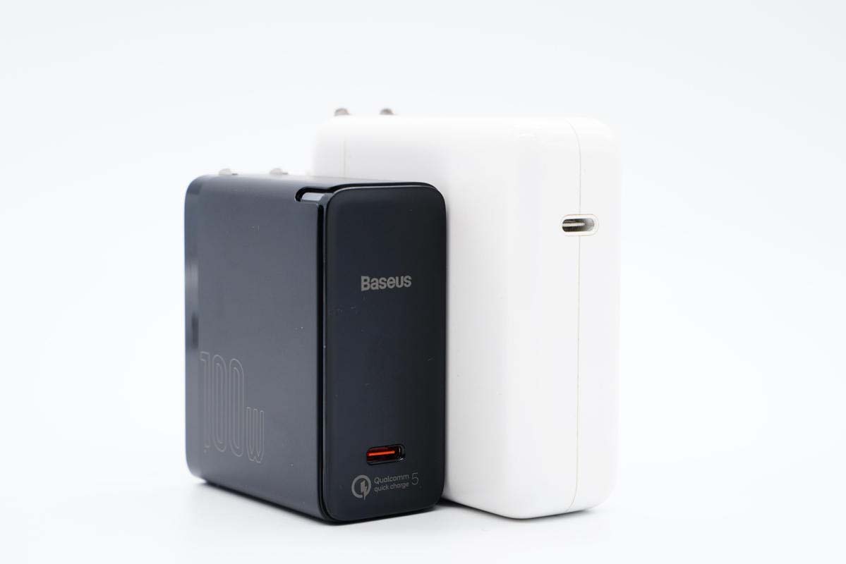 和蘋(píng)果96W充電器直觀對(duì)比,整體還要小很多。