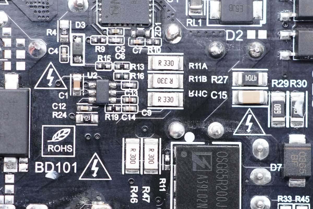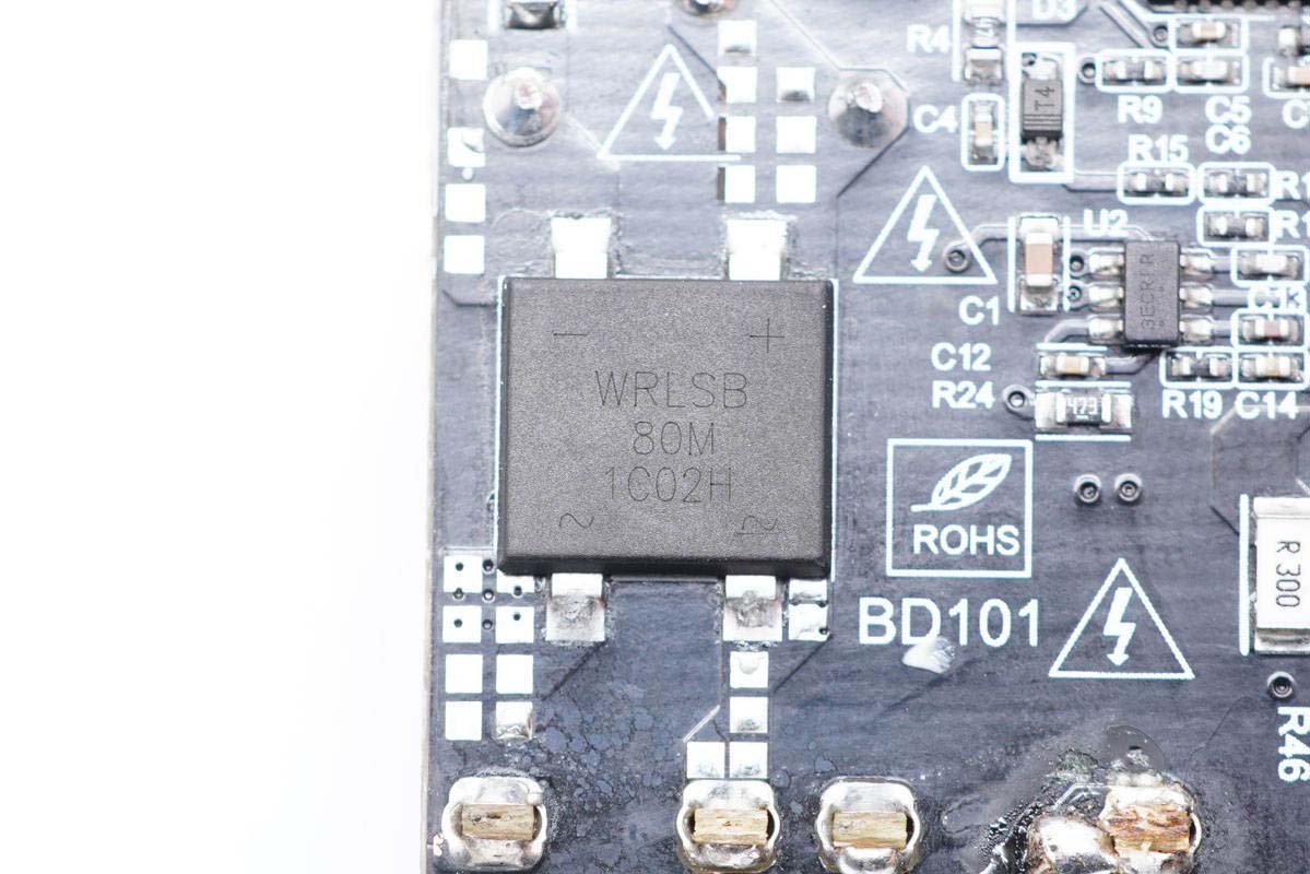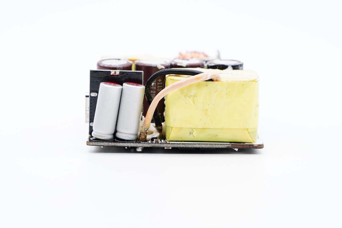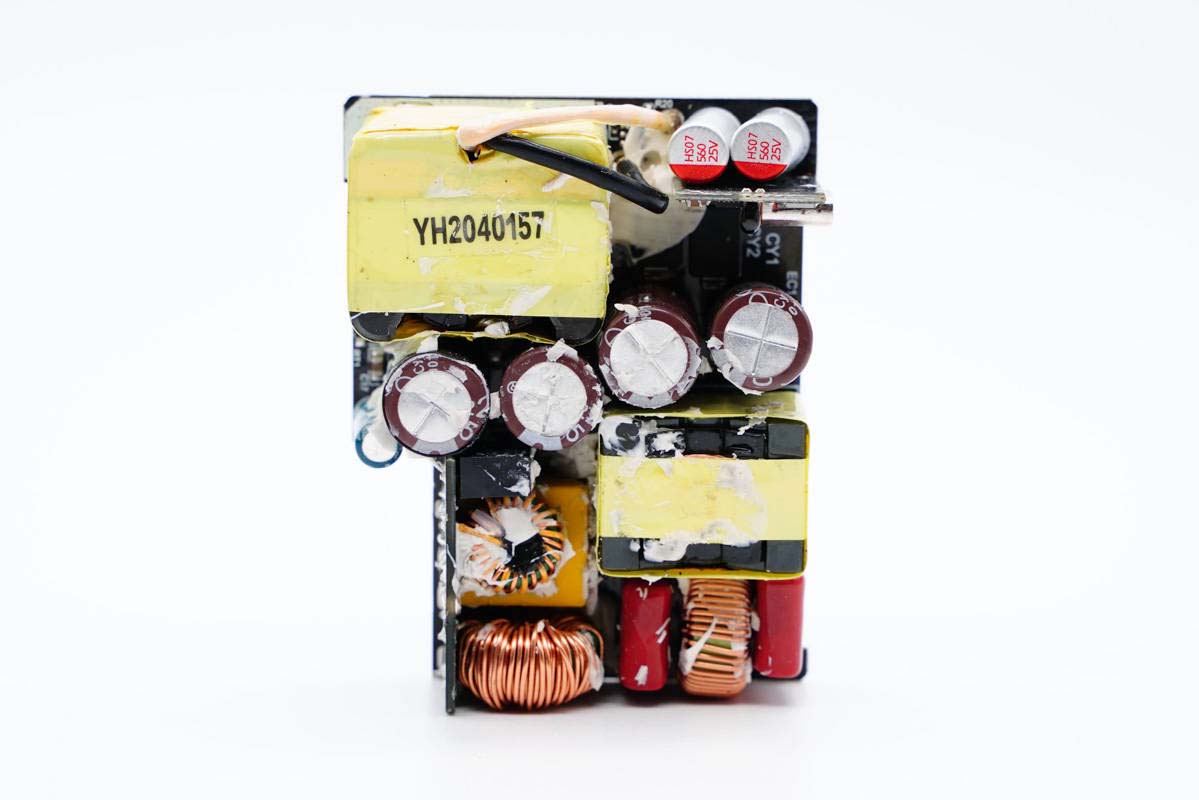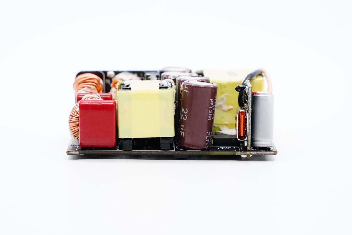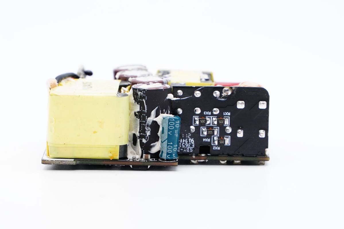 PCB板背面一覽,上端是同步整流管和光耦,中間是PFC升壓控制器、升壓開(kāi)關(guān)管、PWM控制器和高壓開(kāi)關(guān)管,最下端是一顆整流橋。