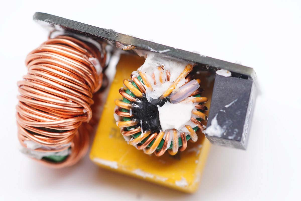 輸入端一覽,左側(cè)垂直焊接小板,右側(cè)主板上設(shè)有兩顆薄膜電容和濾波電感。