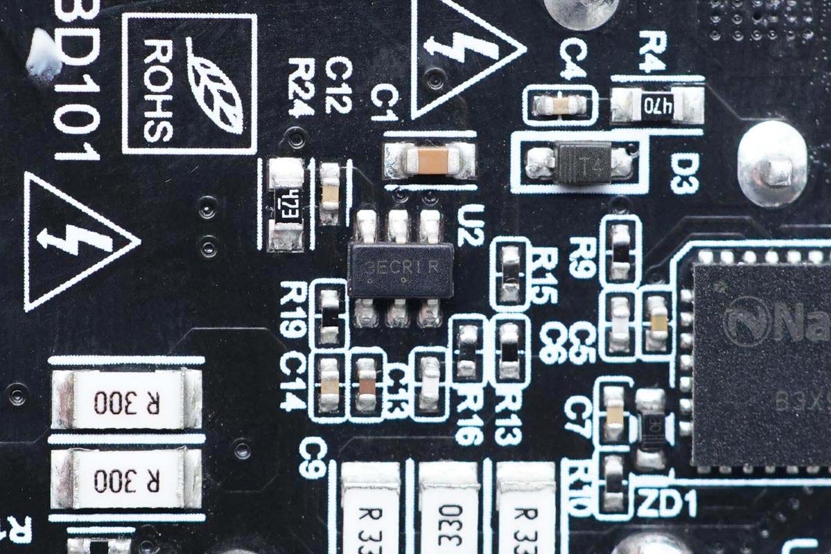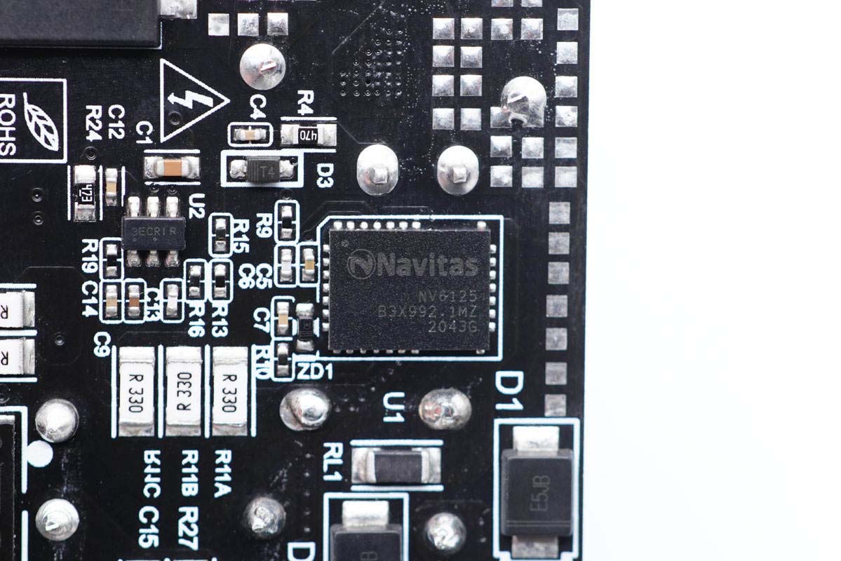 充電頭網(wǎng)通過(guò)拆解了解到,PCBA模塊上的元器件規(guī)劃布局整齊有序,打膠,配備散熱片等常規(guī)設(shè)計(jì)也沒(méi)有少。此外作為一款大功率充電器,PFC升壓電路也是不可少的,升壓開(kāi)關(guān)管采用納微NV6125氮化鎵功率芯片。