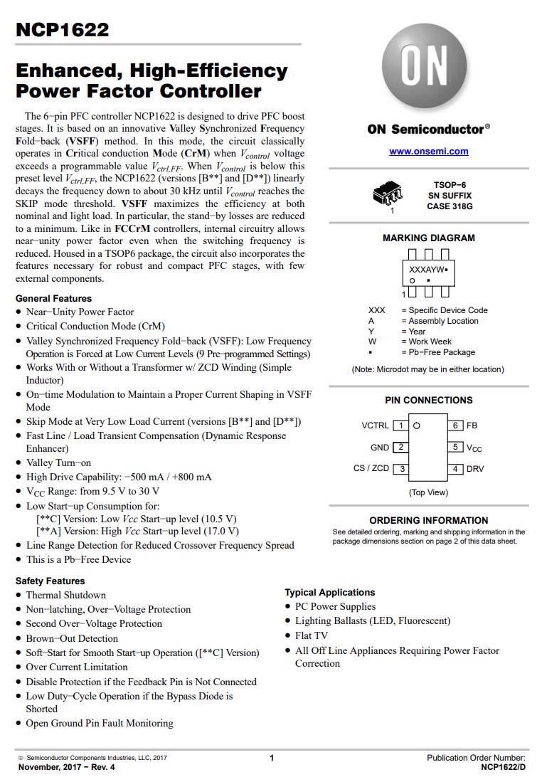 PFC升壓控制器,安森美NCP1622BEC,具有創(chuàng)新的谷同步頻率折返,可最大限度的提高效率。