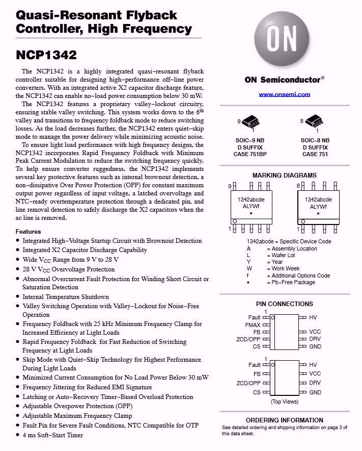 開(kāi)關(guān)電源主控芯片為ON安森美NCP1342,這是一顆高頻初級(jí)PWM控制器,內(nèi)置主動(dòng)X2電容放電和多重完善的保護(hù)功能,具有超低的待機(jī)功耗。