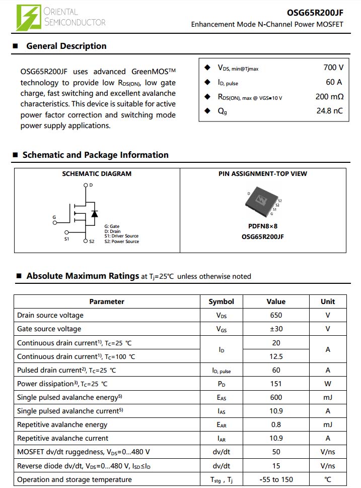 高壓開(kāi)關(guān)MOS管采用東微OSG65R200J,耐壓700V,導(dǎo)阻200mΩ,PDFN8x8封裝。