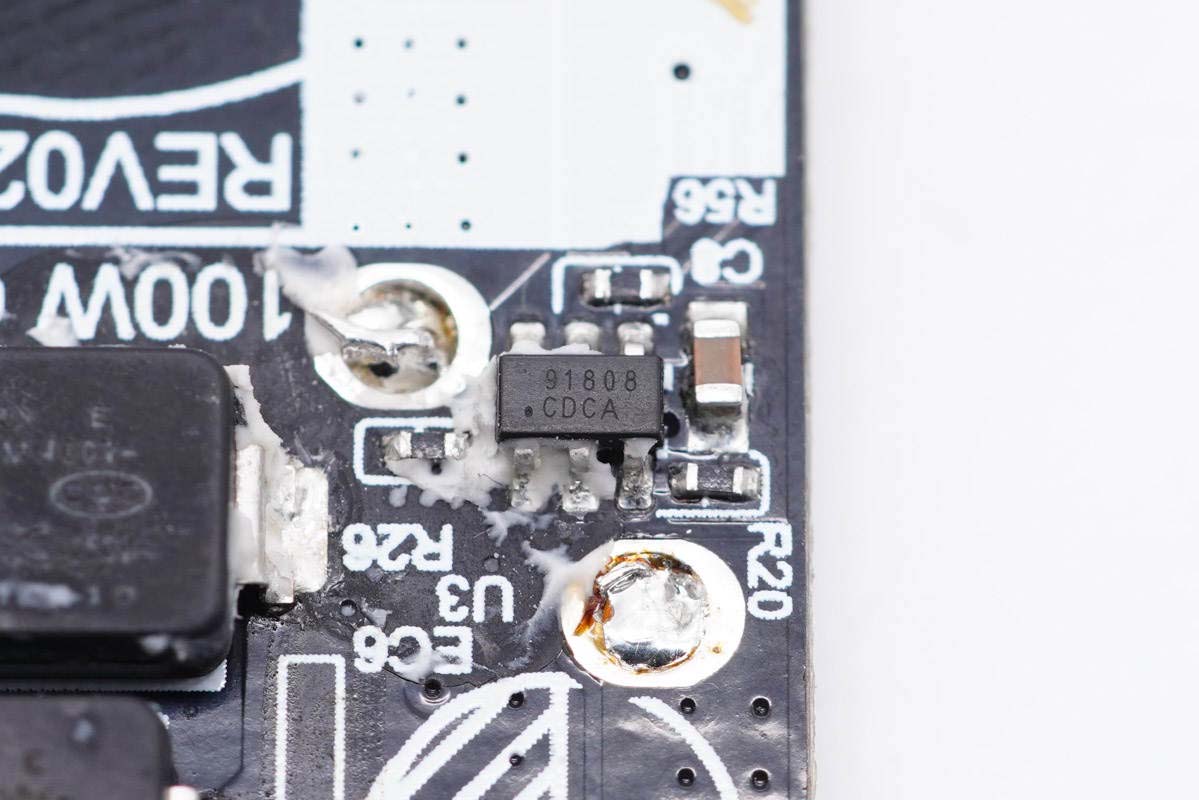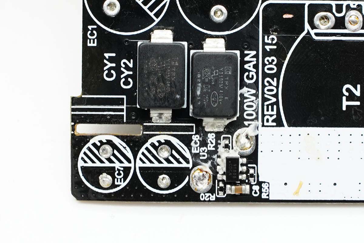 拆掉電容和小板,主板該區(qū)域還設(shè)有兩顆貼片Y電容以及同步整流控制器。