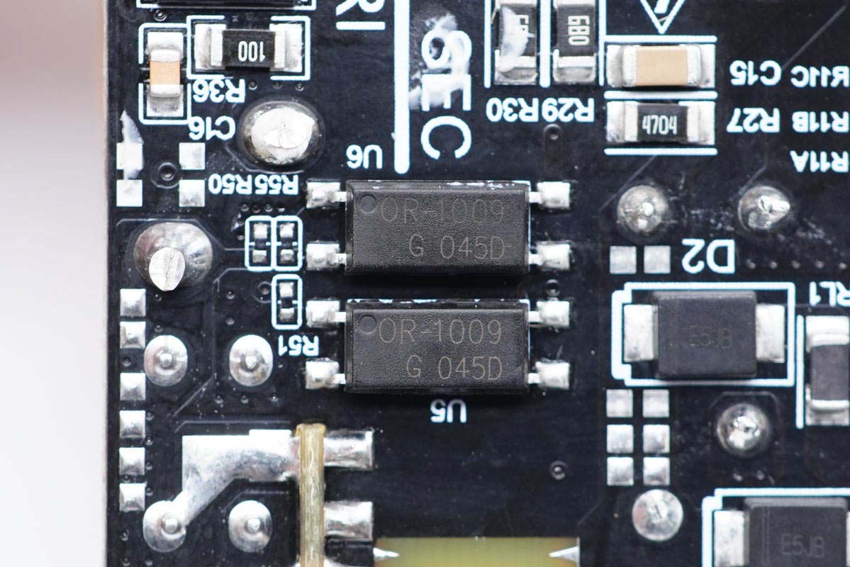 兩顆OR-1009光耦,橫跨在初級(jí)和次級(jí)之間,分別用于初級(jí)次級(jí)通信,反饋調(diào)節(jié)輸出電壓和保護(hù)控制功能。