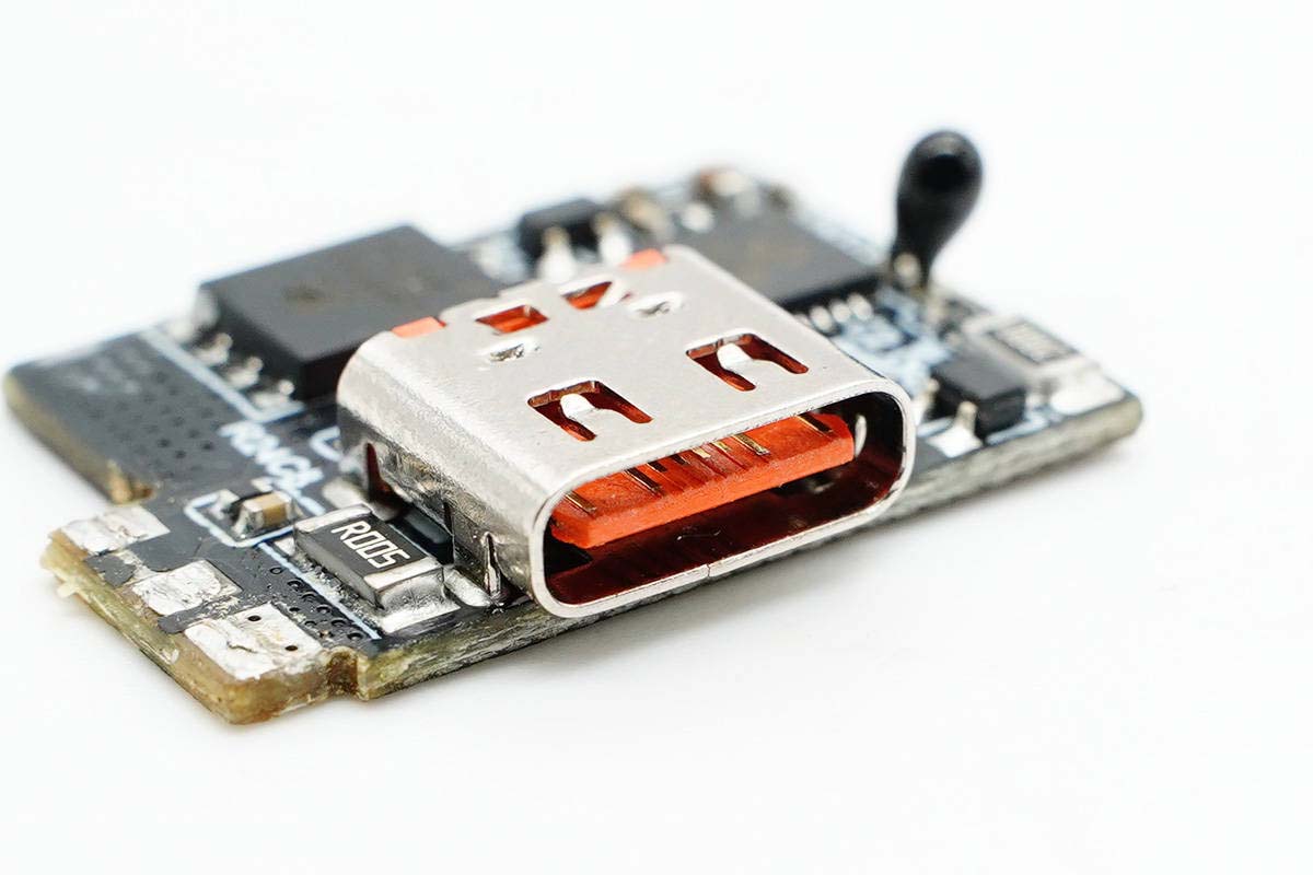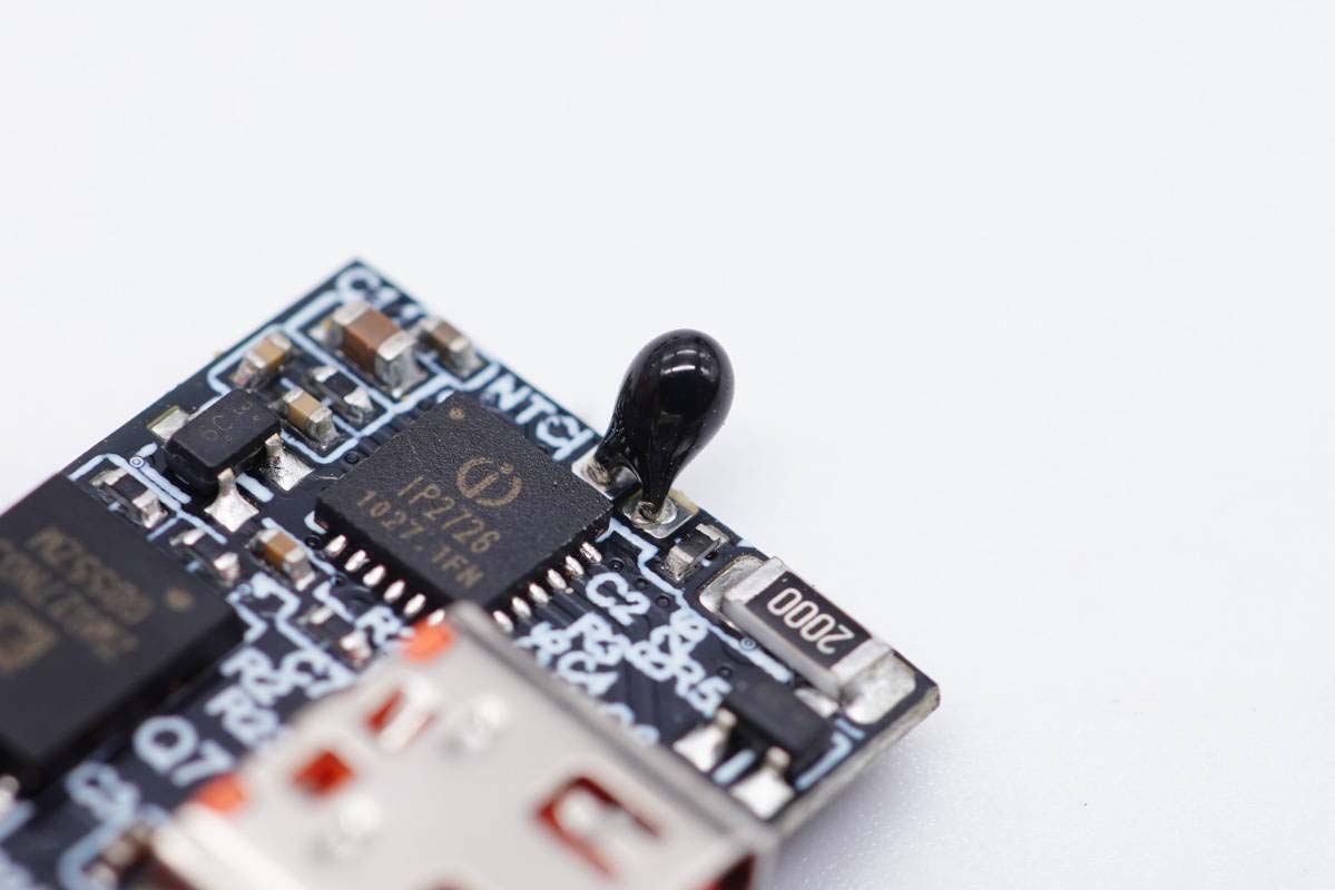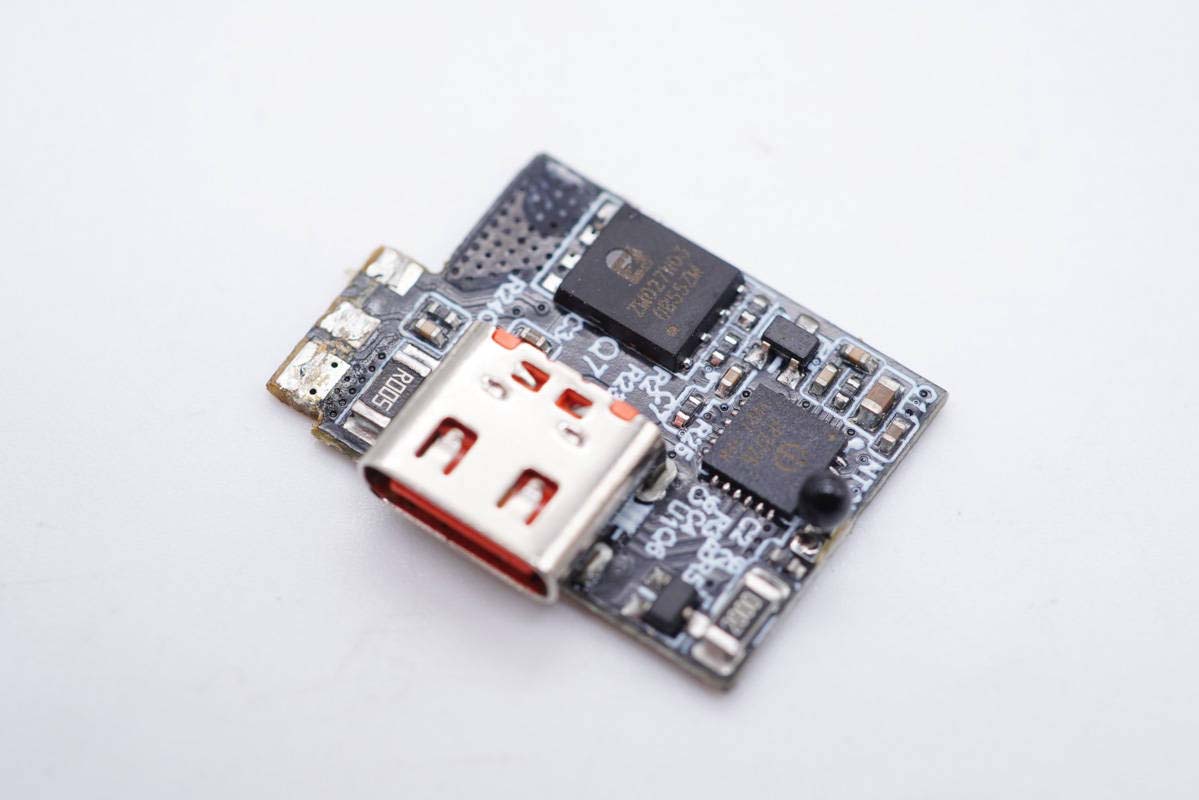 輸出端小板正面設(shè)有協(xié)議芯片、輸出VBUS開(kāi)關(guān)管和熱敏電阻。